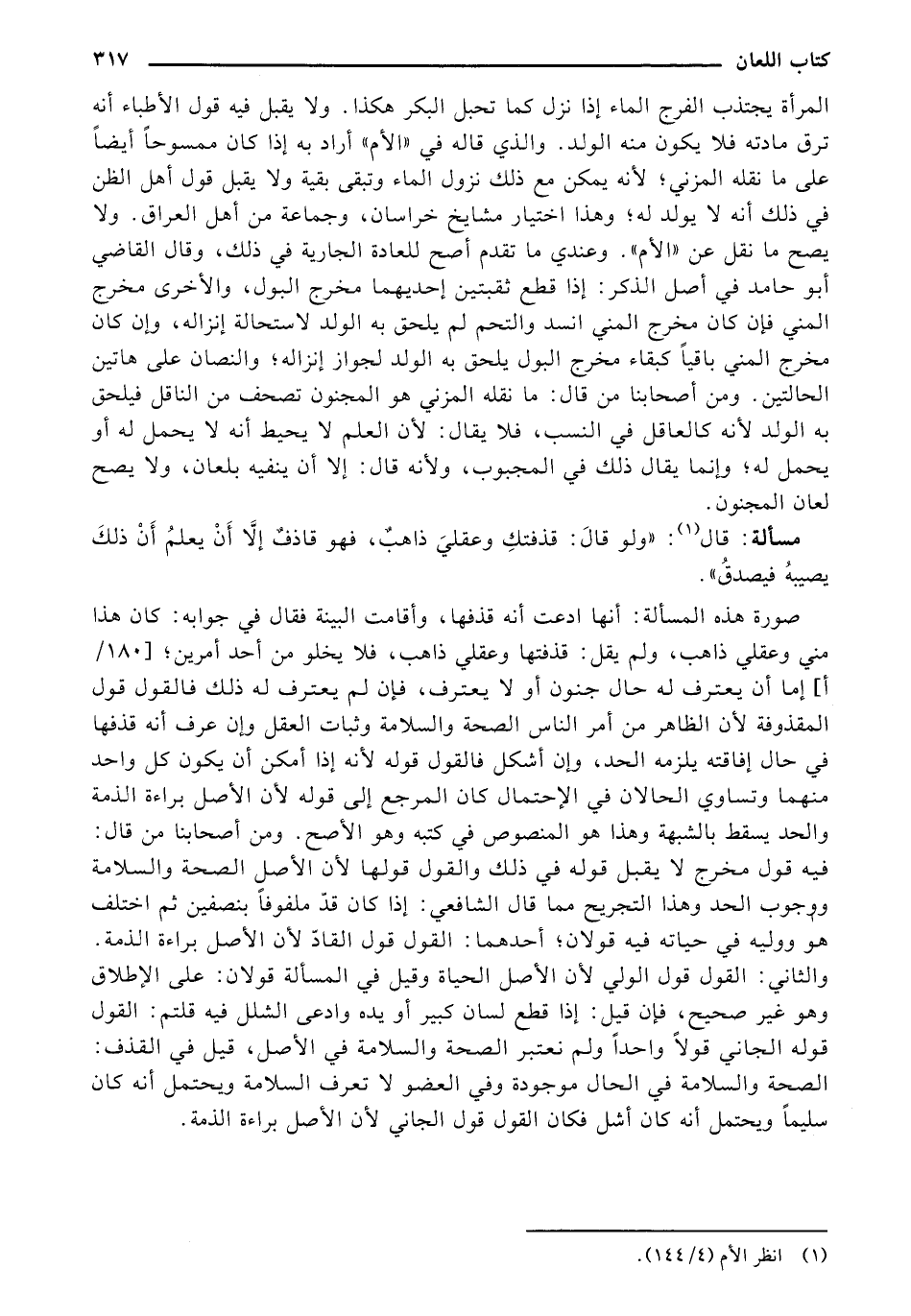 المرأة يجتذب الفرج الماء إذا نزل كما تحبل البكر هكذا. ولا يقبل فيه قول الأطباء أنه ترق مادته فلا يكون منه الولد. والذي قاله في "الأم" أراد به إذا كان ممسوحًا أيضًا على ما نقله المزني؛ لأنه يمكن مع ذلك نزول الماء وتبقى بقية ولا يقبل قول أهل الظن في ذلك أنه لا يولد له؛ وهذا اختيار مشايخ خراسان، وجماعة من أهل العراق. ولا يصح ما نقل عن "الأم". وعندي ما تقدم أصح للعادة الجارية في ذلك، وقال القاضي أبو حامد في أصل الذكر: إذا قطع ثقبتين إحديهما مخرج البول، والأخرى مخرج المني فإن كان مخرج المني انسد والتحم لم يلحق به الولد لاستحالة إنزاله، وإن كان مخرج المني باقيًا كبقاء مخرج البول يلحق به الولد لجواز إنزاله؛ والنصان على هاتين الحالتين. ومن أصحابنا من قال: ما نقله المزني هو المجنون تصحف من الناقل فيلحق به الولد لأنه كالعاقل في النسب، فلا يقال: لأن العلم لا يحيط أنه لا يحمل له أو يحمل له؛ وإنما يقال ذلك في المجبوب، ولأنه قال: إلا أن ينفيه بلعان، ولا يصح لعان المجنون.