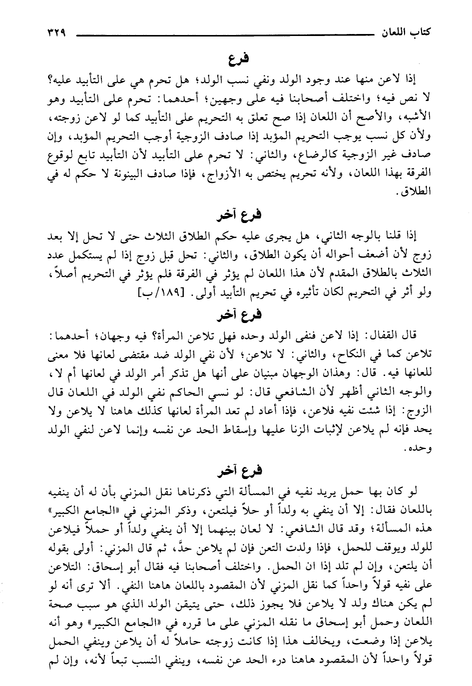 إذا قلنا بالوجه الثاني، هل يجرى عليه حكم الطلاق الثلاث حتى لا تحل إلا بعد زوج لأن أضعف أحواله أن يكون الطلاق، والثاني: تحل قبل زوج إذا لم يستكمل عدد الثلاث بالطلاق المقدم لأن هذا اللعان لم يؤثر في الفرقة فلم يؤثر في التحريم أصلاً، ولو أثر في التحريم لكان تأثيره في تحريم التأبيد أولى. [189/ ب]