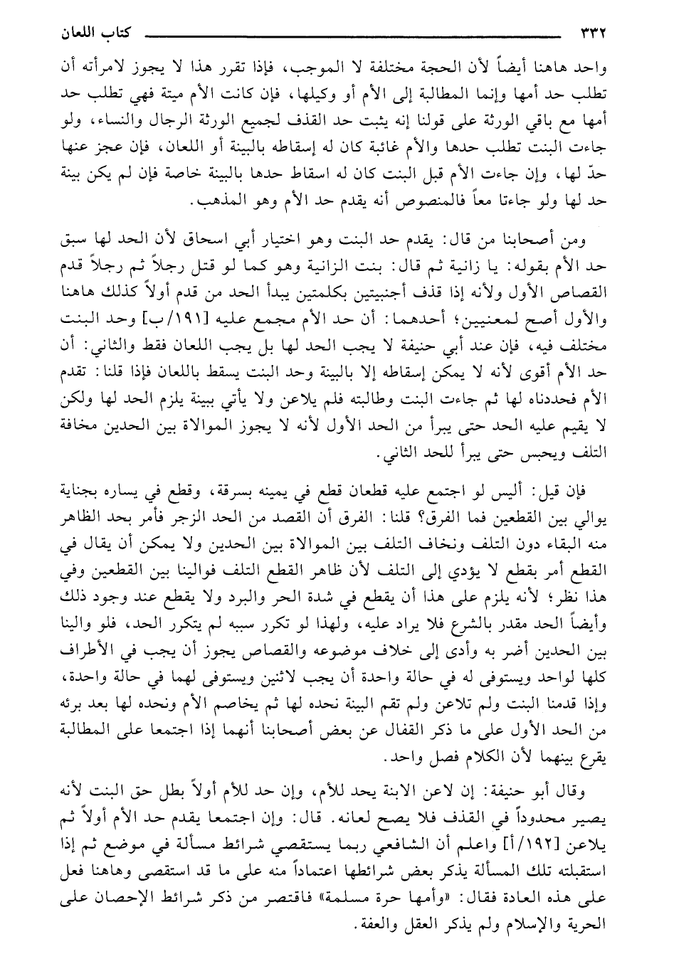 وقال أبو حنيفة: إن لاعن الابنة يحد للأم، وإن حد للأم أولاً بطل حق البنت لأنه يصير محدوداً في القذف فلا يصح لعانه. قال: وإن اجتمعا يقدم حد الأم أولاً ثم يلاعن [192/ أ] واعلم أن الشافعي ربما يستقصي شرائط مسألة في موضع ثم إذا استقبلته تلك المسألة يذكر بعض شرائطها اعتمادًا منه على ما قد استقصى وهاهنا فعل على هذه العادة فقالك "وأمها حرة مسلمة" فاقتصر من ذكر شرائط الإحصان على الحرية والإسلام ولم يذكر العقل والعفة.