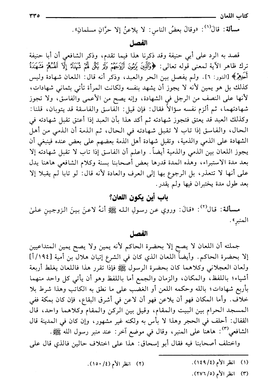 جملته أن اللعان لا يصح إلا بحضرة الحاكم لأنه يمين ولا يصح يمين المتداعيين إلا بحضرة الحاكم. وأيضًا اللعان الذي كان في الشرع إتيان هلال بن أمية [194/ أ] ولعان العجلاني وكلاهما كان بحضرة الرسول صلى الله عليه وسلم فإذا تقرر هذا فاللعان يغلط أربعة أشياء؛ باللفظ، والمكان، والزمان، والجمع أما باللفظ وهو أن يأتي كل واحد منهما بأربع شهادات؛ بالله وحكمه اللعن أو الغضب على ما نطق به الكاتب وهذا شرط بلا خلاف. وأما المكان فهو أن يلاعن فهو أن لاعن في أشرق البقاع، فإن كان بمكة ففي المسجد الحرام بين البيت والمقام، وقيل بين الركن والمقام وكلاهما واحد، قال القفال: أحلف في الحجر وهذا لا بأس به ولكنه غير مشهور، وإن كان في المدينة قال الشافعي: هاهنا على المنبر، وقال في موضع آخر: عند منبر رسول الله صلى الله عليه وسلم.