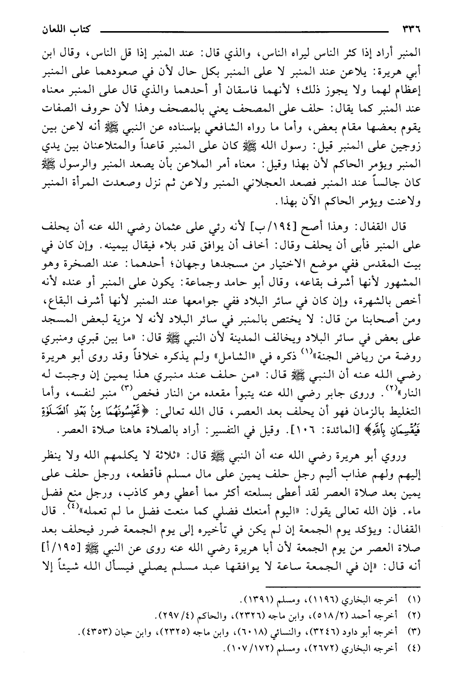 قال القفال: وهذا أصح [194/ ب] لأنه رثي على عثمان رضي الله عنه أن يحلف على المنبر فأبى أن يحلف وقال: أخاف أن يوافق قدر بلاء فيقال بيمينه. وإن كان في بيت المقدس ففي موضع الاختيار من مسجدها وجهان؛ أحدهما: عند الصخرة وهو المشهور لأنها أشرف بقاعه، وقال أبو حامد وجماعة: يكون على المنبر أو عنده لأنه أخص بالشهرة، وإن كان في سائر البلاد ففي جوامعها عند المنبر لأنها أشرف البقاع، ومن أصحابنا من قال: لا يختص بالمنبر في سائر البلاد لأنه لا مزية لبعض المسجد على بعض في سائر البلاد ويخالف المدينة لأن النبي صلى الله عليه وسلم قال: "ما بين قبري ومنبري روضة من رياض الجنة" ذكره في "الشامل" ولم يذكره خلافًا وقد روى أبو هريرة رضي الله عنه أن النبي صلى الله عليه وسلم قال: "من حلف عند منبري هذا يمين إن وجبت له النار". وروى جابر رضي الله عنه يتبوأ مقعده من النار فخص منبر لنفسه، وأما التغليظ بالزمان فهو أن يحلف بعد العصر، قال الله تعالى: {تَحْبِسُونَهُمَا مِنْ بَعْدِ الصَّلاةِ فَيُقْسِمَانِ بِاللَّهِ} [المائدة: 106]. وقيل في التفسير: أراد بالصلاة هاهنا صلاة العصر.