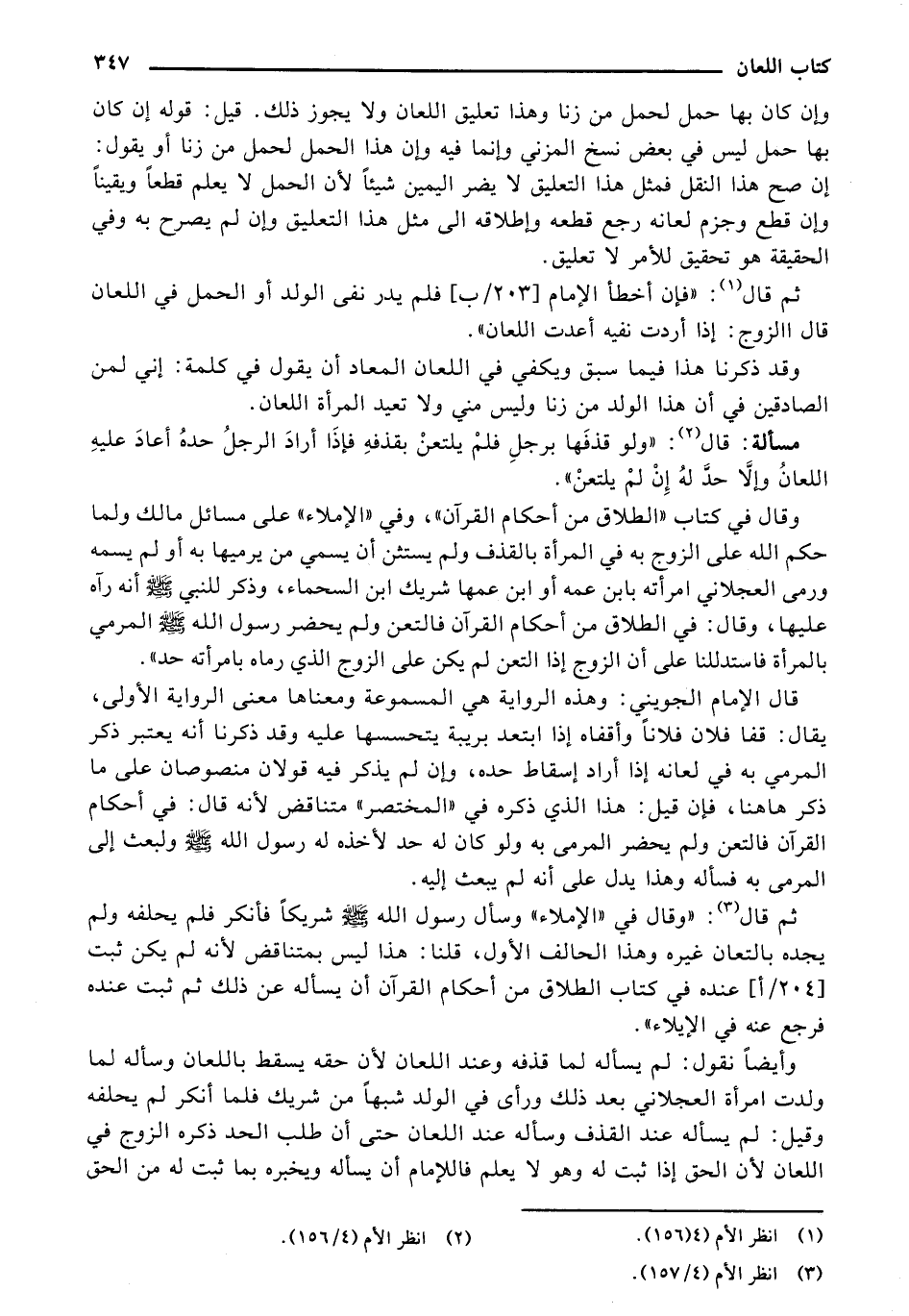 وقال في كتاب "الطلاق من أحكام القرآن"، وفي "الإملاء" على مسائل مالك ولما حكم الله على الزوج به في المرأة بالقذف ولم يستثن أن يسمي من يرميها به أو لم يسمه ورمى العجلاني امرأته بابن عمه أو ابن عمها شريك ابن السحماء، وذكر للنبي صلى الله عليه وسلم أنه رآه عليها، وقال: في الطلاق من أحكام القرآن فالتعن ولم يحضر رسول الله صلى الله عليه وسلم المرمي بالمرأة فاستدللنا على أن الزوج إذا التعن لم يكن على الزوج الذي رماه بامرأته حد".