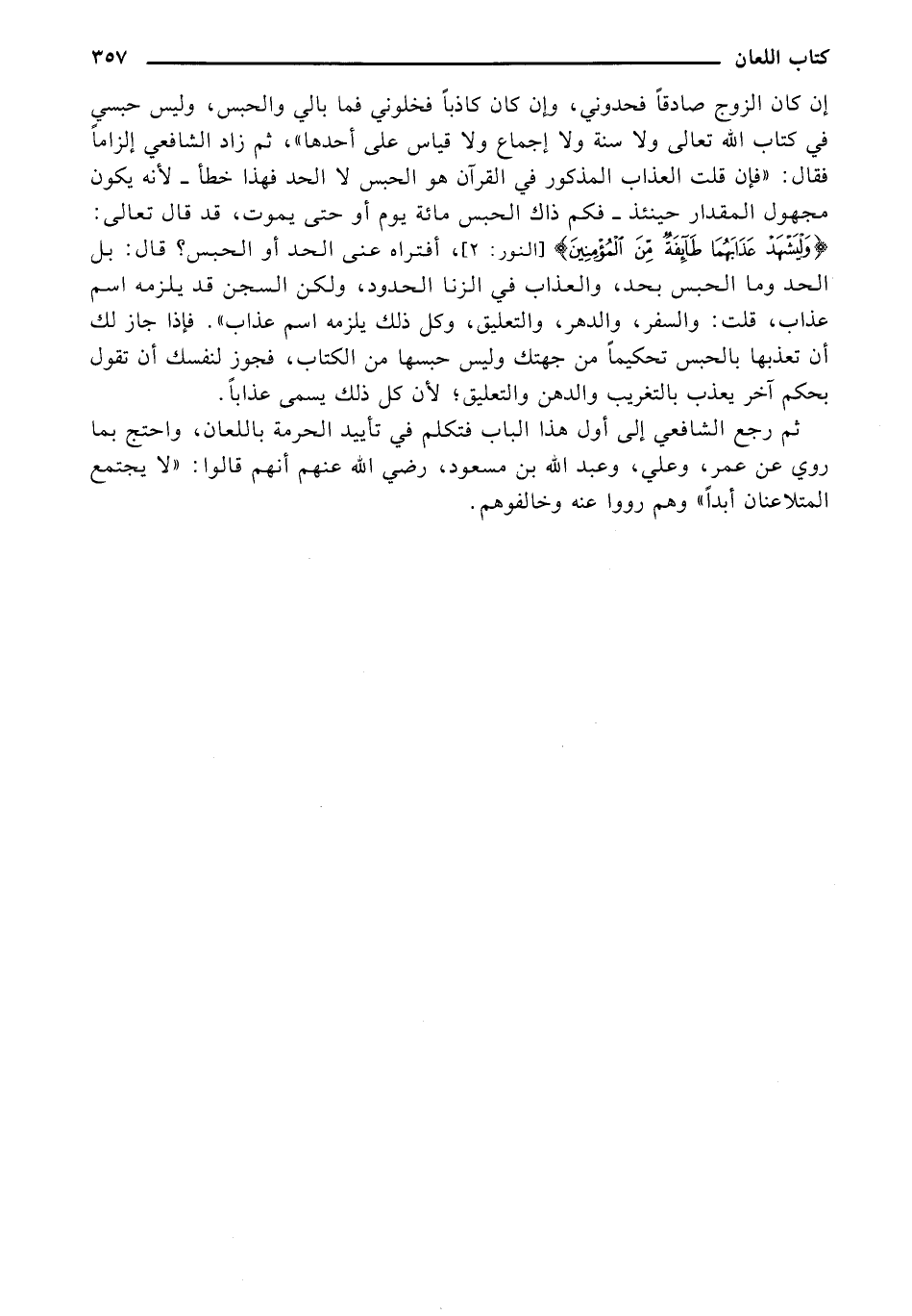 إن كان الزوج صادقًا فحدوني، وإن كان كاذبًا فخلوني فما بالي والحبس، وليس حبسي في كتاب الله تعالى ولا سنة ولا إجماع ولا قياس على أحدها"، ثم زاد الشافعي إلزامًا فقال: "فإن قلت العذاب المذكور في القرآن هو الحبس لا الحد فهذا خطأ - لأنه يكون مجهول المقدار حينئذ - فكم ذاك الحبس مائة يوم أو حتى يموت، قد قال تعالى: {وَلْيَشْهَدْ عَذَابَهُمَا طَائِفَةٌ مِنْ الْمُؤْمِنِينَ} [النور: 2]، أفتراه عنى الحد أو الحبس؟ قال: بل الحد وما الحبس بحد، والعذاب في الزنا الحدود، ولكن السجن قد يلزمه اسم عذاب، قلت: والسفر، والدهر، والتعليق، وكل ذلك يلزمه اسم عذاب". فإذا جاز لك أن تعذبها بالحبس تحكيمًا من جهتك وليس حبسها من الكتاب، فجوز لنفسك أن تقول بحكم آخر يعذب بالتغريب والدهن والتعليق؛ لأن كل ذلك يسمى عذابًا.