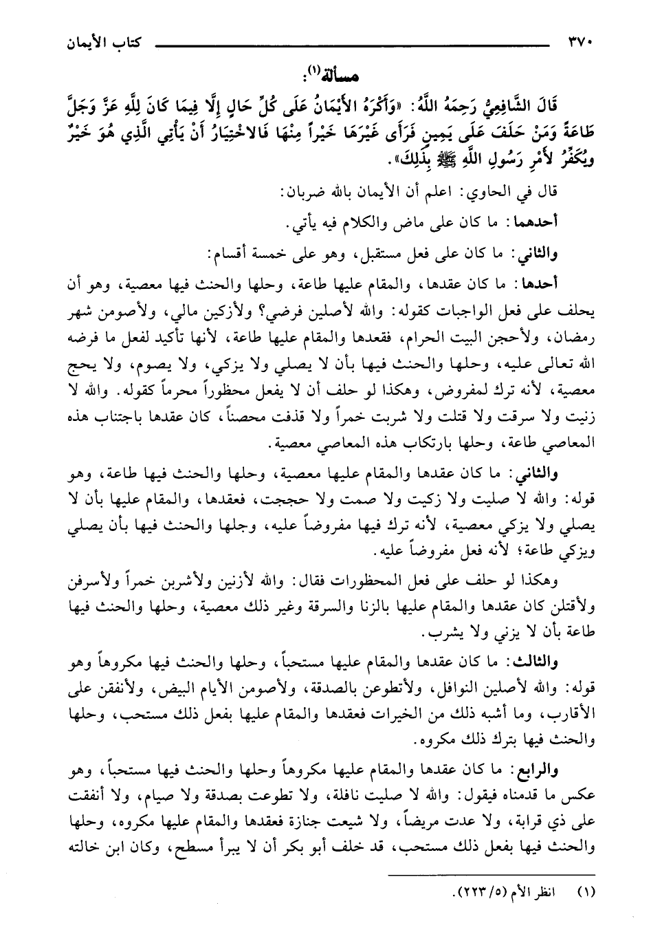 قال الشافعي رحمه الله: "وأكره الأيمان على كل حال إلا فيما كان لله عز وجل طاعة ومن حلف على يمين فرأى غيرها خيرًا منها فالاختيار أن يأتي الذي هو خير ويكفر لأمر رسول الله صلى الله عليه وسلم بذلك".