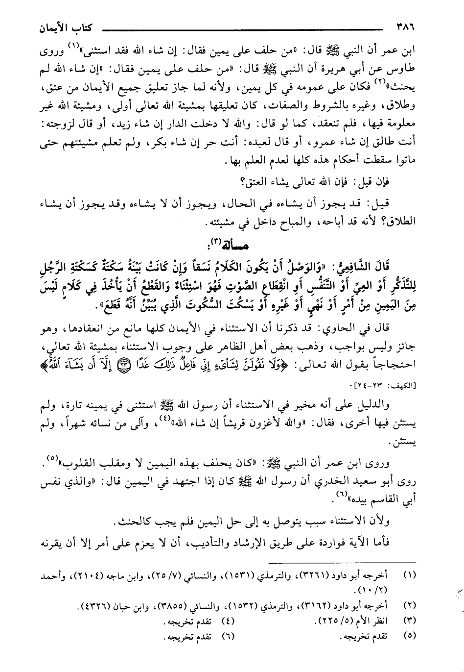 ابن عمر أن النبي صلى الله عليه وسلم قال: "من حلف على يمين فقال: إن شاء الله فقد استثنى" وروى طاوس عن أبي هريرة أن النبي صلى الله عليه وسلم قال: " من حلف على يمين فقال: إن شاء الله لم يحنث" فكان على عمومه في كل يمين، ولأنه لما جاز تعليق جميع الأيمان من عتق، وطلاق، وغيره بالشروط والصفات، كان تعليقها بمشيئة الله تعالى أولى، ومشيئة الله غير معلومة فيها، فلم تنعقد، كما لو قال: والله لا دخلت الدار إن شاء زيد، أو قال لزوجته أنت طالق إن شاء عمرو، أو قال لعبده: أنت حر إن شاء بكر، ولم تعلم مشيئتهم حتى ماتوا سقطت أحكام هذه كلها لعدم العلم بها.