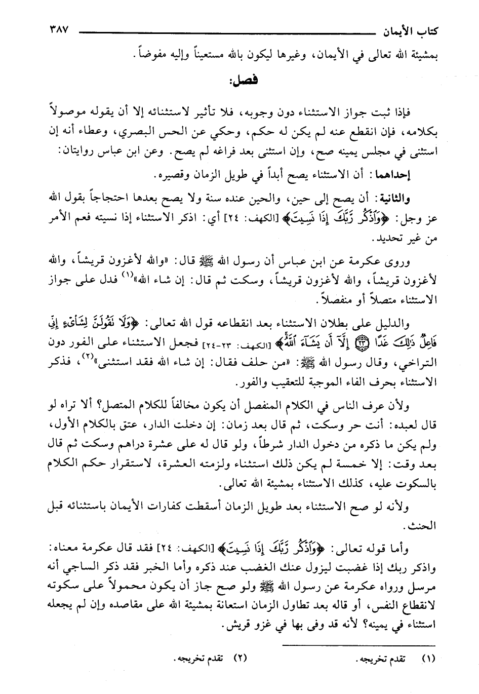 والدليل على بطلان الاستثناء بعد انقطاعه قول الله تعالى" {ولا تَقُولَنَّ لِشَيْءٍ إنِّي فَاعِلٌ ذَلِكَ غَدًا (23) إلاَّ أَن يَشَاءَ اللَّهُ} [الكهف: 23 - 24]. فجعل الاستثناء على الفور دون التراخي، وقال رسول الله صلى الله عليه وسلم: "من حلف فقال: إن شاء الله فقد استثنى"، فذكر الاستثناء بحرف الفاء الموجبة للتعقيب والفور.