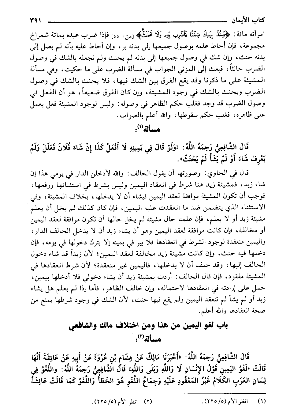 امرأته مائةً، {وَخُذْ بِيَدِكَ ضِغْثًا فَاضْرِب بِّهِ وَلَا تَحْنَثْ} [ص: (44)] فإذا ضرب عبده بمائةَ شمراخ مجموعةً، فإن أحاط علمه بوصول جميعها إلى بدنه بر، وإن أحاط عليه بأنه لم يصل إلى بدنه حنث، وإن شك في وصول جميعها إلى بدنه لم يحنث ولم نجعله بالشك في وصول الضرب حانثا، فبعث إلى المزني الجواب في مسألة الضرب على ما حكيت، وفي مسألة المشيئةَ على ما ذكرنا وقد يقع الفرق بين الشك فيها، فلا يحنث بالشك في وصول الضرب ويحنث بالشك في وجود المشيئةَ، وإن كان الفرق ضعيفًا، هو أن الفعل في وصول الضرب قد وجد فغلب حكم الظاهر في وصوله: وليس لوجود المشيئةَ فعل يعمل على ظاهره، فغلب حكم سقوطها، والله أعلم بالصواب.
