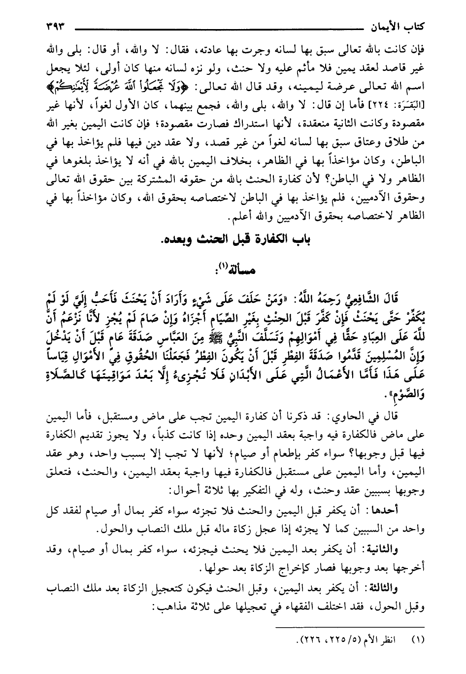 قَالُ الشَّافِعِيِ رحمَهُ اللَّهُ: "وَمِنْ حِلْفَ عَلَى شَيْءِ وَأَرَادَ أَنْ يَحْنَثَ فَأُحِبُّ إلي لَوْ لَمْ يُكْفَرْ حَتَّى يَحْنَثَ فَإِنَّ كفرَ قَبْلَ الْحِنْثِ بِغَيْرَ الصِّيَامَ أَجْزَأُهُ وَإِنَّ صَامَ لَمْ يَجِزْهُ لَأَنَا نَزْعَمُ أَنْ لله عَلَى الْعُبَّادِ حَقَّا فِي أَمَوَّالِهُمْ وَتَسَلُّفَ -النَّبِيِّ صَلَّى اللَّهُ عَلَيه وَسَلْمَ- مِنْ الْعباسِ صَدُقَةَ عَامِّ قَبْلَ أَنْ يدخل وَأَنْ الْمُسَلَّمَيْنِ قَدَّمُوا صَدَقَةَ الْفِطْرِ قَبْلَ أَنْ يُكَوِّنَ الْفِطَرُ فَجُعَلَنَا الْحُقُوقَ فِي الأموال قِيَاسَا عَلَى هَذَا فَأَمَا الأعمال الَّتِي عَلَى الأبدان فَلَا تَجْزِيءَ إلا بَعْدَ مَوَاقِيتِهَا كَالْصَّلاَةِ".