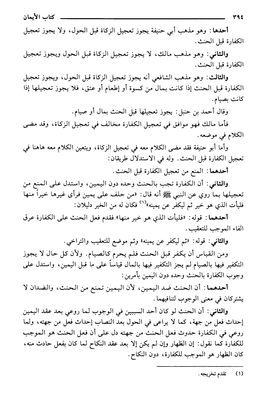 وأما أبو حنيفةً فقد مضى الكلام معه في تعجيل الزكاةً، ويتعين الكلام معه هاهنا في تعجيل الكفارةً قبل الحنث. وله في الاستدلال طريقان: