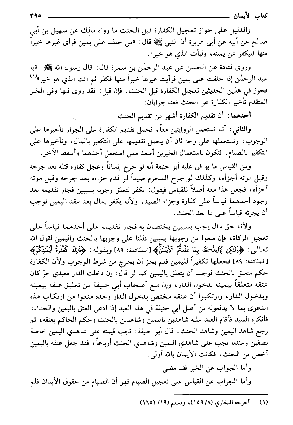 والثاني: أننا نستعمل الروايتين معًا، فحمل تقديم الكفارةَ على الجواز تأخيرها على الوجوب، وتستعملها على وجهٍ ثان أن يحمل تقديمها على التكفير بالمال، وتأخيرها على التكفير بالصيام. فتكون باستعمال الخيرين أسعد ممن استعمل أحدهما وأسقط الآخر.