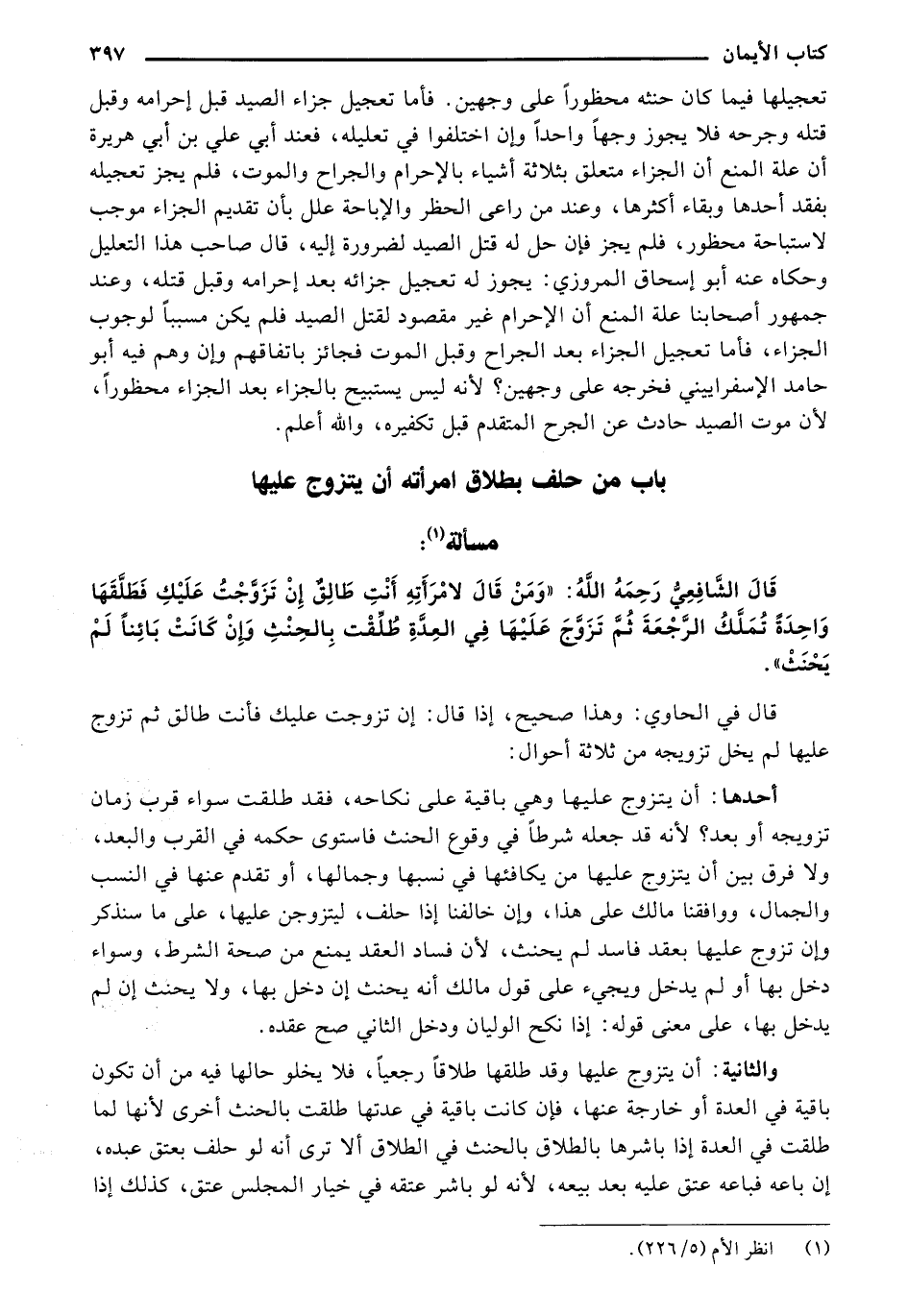 تعجيلها فيما كان حنثه محظورًا على وجهين. فأما تعجيل جزاء الصيد قبل إحرامه وقبل قتله وجرحه فلا يجوز وجهًا واحدًا وإن اختلفوا في تعليله، فعند أبي علي بن أبي هريرةً أن علةَ المنع أن الجزاء متعلق بثلاثةَ أشياء بالإحرام والجراح والموت، فلم يجز تعجيله بمد أحدها وبقاء أكثرها، وعند من راعى الحظر والإباحةَ علل بأن تقديم الجزاء موجب لاستباحةُ محظور، فلم يجز فإن حل له قتل الصيد لضرورةً إليه، قال صاحب هذا التعليل وحكاه عنه أبو إسحاق المروري: يجوز له تعجيل جزائه بعد إحرامه وقبل قتله، وعند جمهور أصحابنا علة المنع آن الإحرام غير مقصود لقتل الصيد فلم يكن سببًا لوجوب الجزاء، فأما تعجيل الجزاء بعد الجراح وقبل الموت فجائز باتفاقهم وإن وهم فيه أبو حامد الإسفراييني فخرجه على وجهين؟ لأنه ليس يستبيح بالجزاء بعد الجزاء محظورًا، لأن موت الصيد حادث عن الجرح المتقدم قبل تكفيره، والله أعلم.
