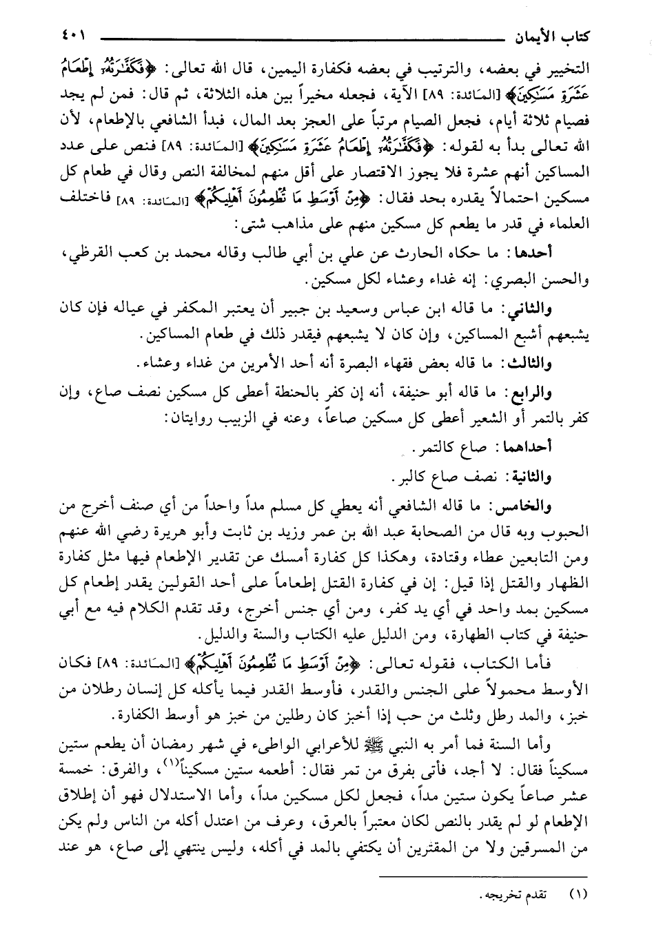 فأما الكتاب، فقوله تعالى: "مِنْ أَوْسَطِ مَا تُطْعِمُونَ أَهْلِيكُمْ " [المائدة: (89)] فكان الأوسط محمولًا على الجنس والقدر، فأوسط القدر فيما يأكله كل إنسان رطلان من خبز، والمد رطل وثلث من حب إذا أخبز كان رطلين من خبز هو أوسط الكفارةً.
