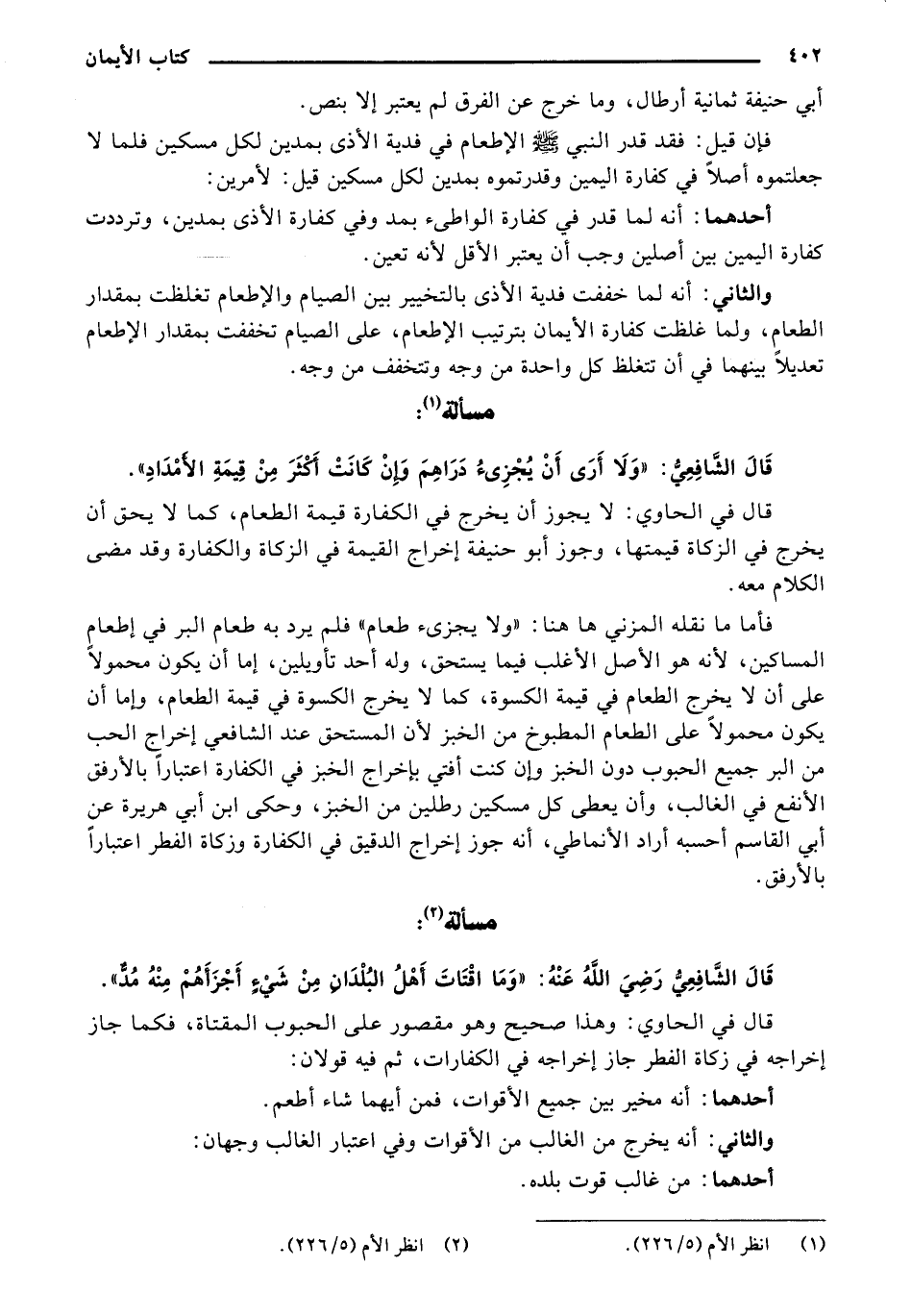 قال في الحاوي: لا يجوز أن يخرج في الكفارةَ قيمةُ الطعام، كما لا يحق أن يخرج في الزكاةَ قيمتها، وجوز أبو حنيفةَ إخراج القيمةَ في الزكاةً والكفارةَ وقد مضى الكلام معه.