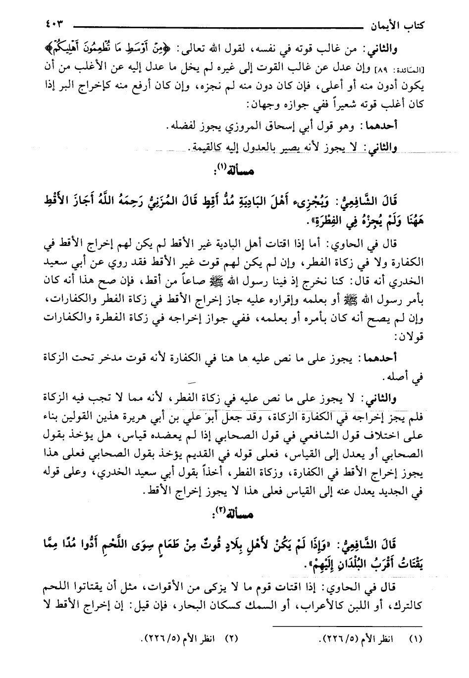 قال الشافعي: "وَإذاً لَمْ يَكِنْ لِأَهِلُ بِلادَ قُوتِ مِنْ طعامِ سِوَى اللُّحَمِ أَدَّوْا مَدَّا مِمَّا يَقْتَاتُ أَقُرْبَ الْبُلْدانِ إِلَيهُمْ ".