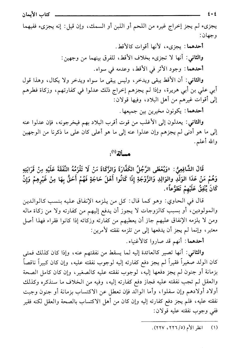 قال الشافعي:" وَيُعْطِي الرَّجُلُ الْكَفَّارَةُ وَالزَّكاَةُ مِنْ لَا تَلْزَمُهُ النَّفَقَةُ عَلَيه مِنْ قَرَابَتِهُ، وَهُمْ مِنْ عَدَا الْوَلَدِ وَالْوَالِدِ وَالزَّوْجَةِ إذاً كَانُوا أَقَلُّ حاجَةَ، فَهُمْ أَحَقَّ بِهَا مِنْ غَيْرَهُمْ، وَإِنَّ كَانَ يُنْفِقُ عَلَيهُمْ تَطَوَّعًا "