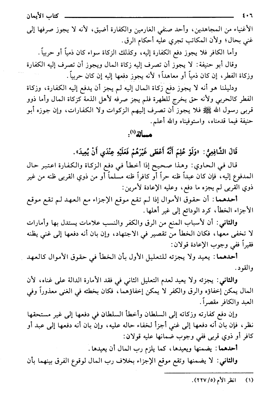 قال في الحاوي: وهذا صحيح إذا أخطأ في دفع الزكاةً والكفارةً اعتبر حال المدفوع إليه، فإن كان عبدًا ظنه حرًا أو كافرًا ظنه مسلمًا آو من ذوي القربى ظنه من غير ذوي القربى لم يجزه ما دفع، وعليه الإعادةً لأمرين: