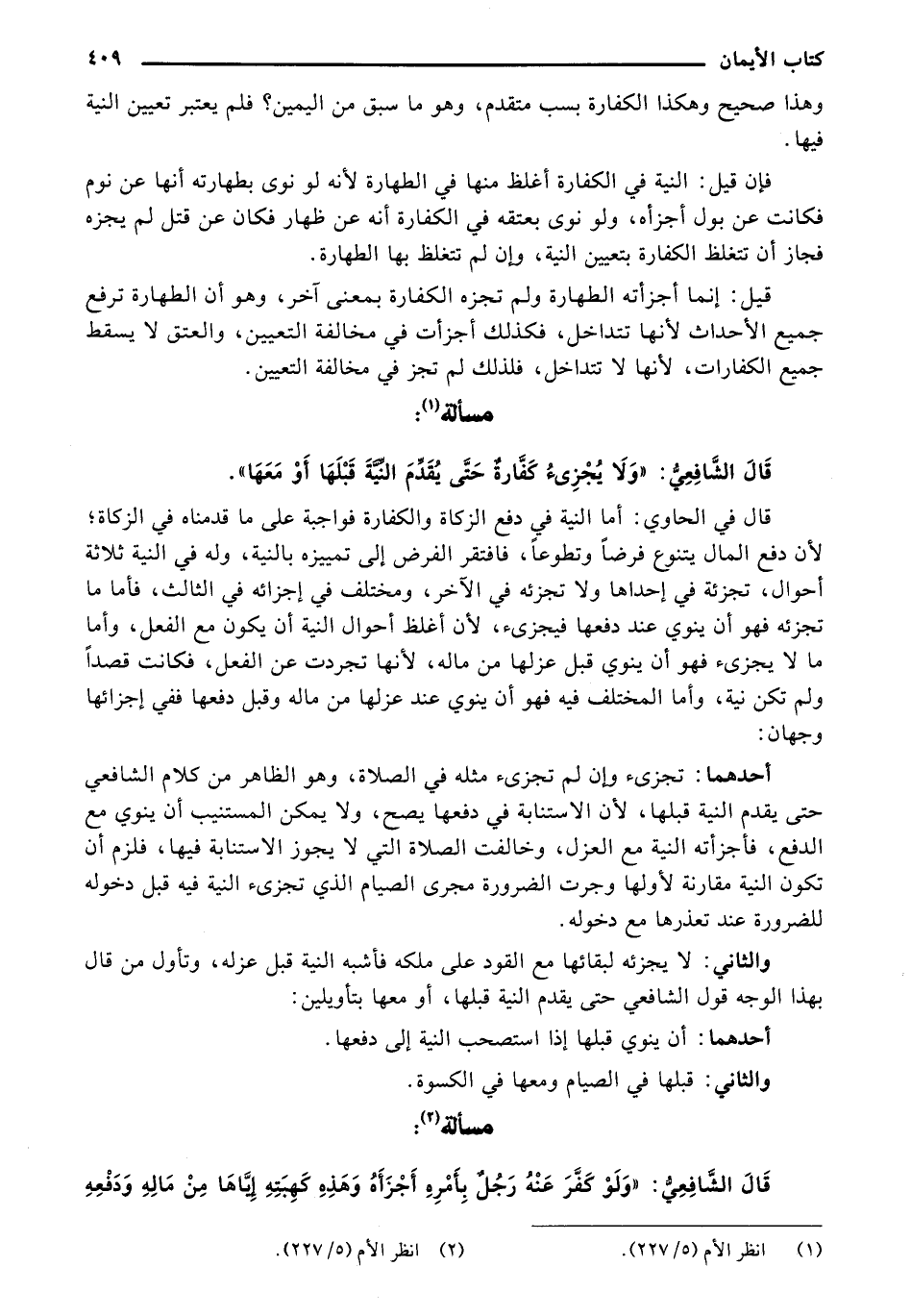 قال في الحاوي: أما النية في دفع الزكاةَ والكفارةَ فواجبةً على ما قدمناه في الزكاةً؛ لأن دفع المال يتنوع فرضًا وتطوعًا، فافتقر الفرض إلى تمييزه بالنيةً، وله في النيةَ ثلاثةَ أحوال، تجزئةُ في إحداها ولا تجزئه في الآخر، ومختلف في إجزائه في الثالث، فأما ما تجزئه فهو أن ينوي عند دفعها فيجزئ؛ لأن أغلظ أحوال النيةً أن يكون مع الفعل، وأما ما لا يجزئ فهو أن ينوي قبل عزلها من ماله، لأنها تجردت عن الفعل، فكانت قصدًا ولم تكن نيةً، وأما المختلف فيه فهو أن ينوي عند عزلها من ماله وقبل دفعها ففي إجرائها وجهان: