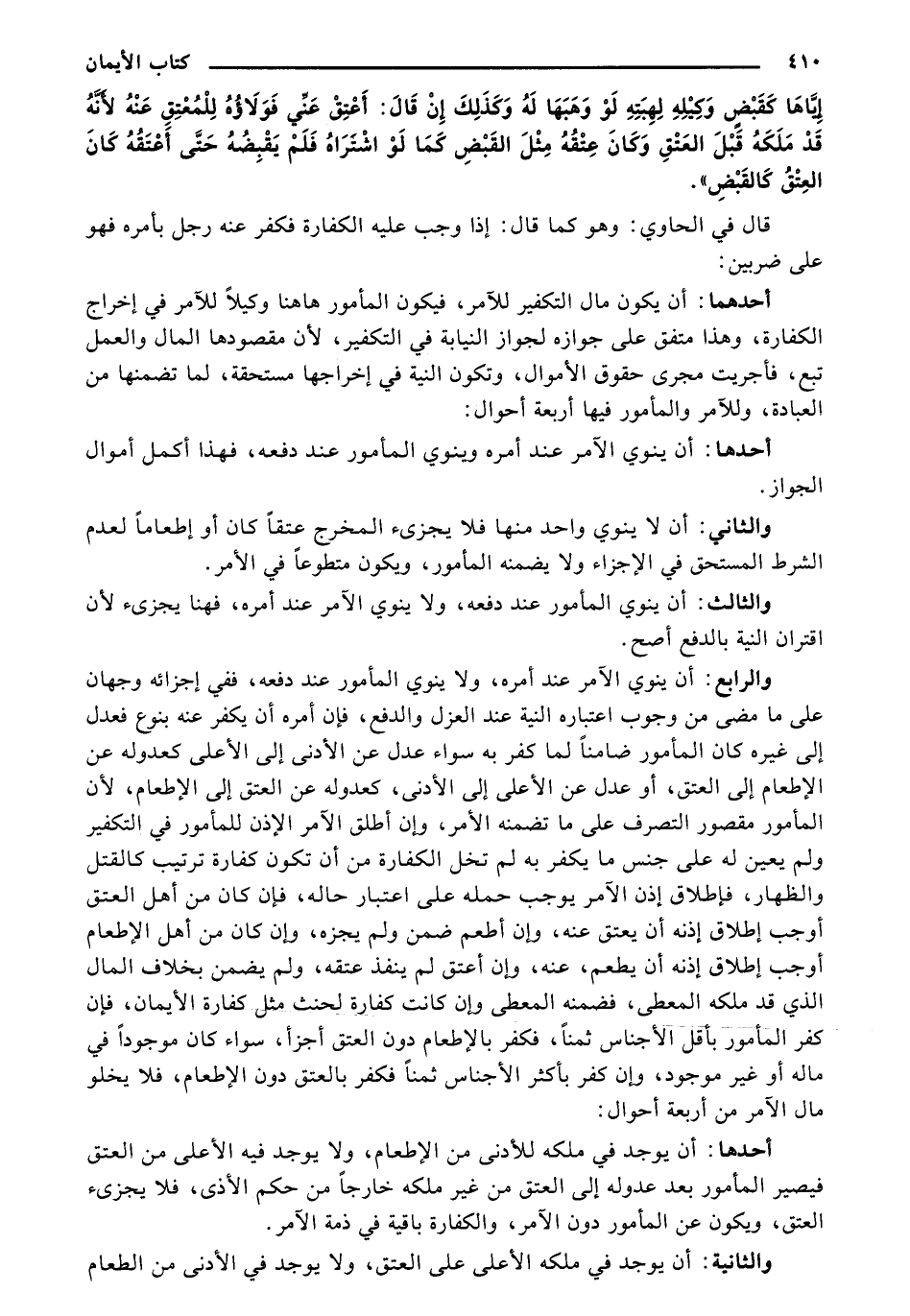 والرابع: آن ينوي الآمر عند آمره، ولا ينوي المأمور عند دفعه، ففي إجرائه وجهان على ما مضى من وجوب اعتباره النيةَ عند العزل والدفع، فإن آمره أن يكفر عنه بنوع فعدل إلى غيره كان المأمور ضامنًا لما كفر به سواء عدل عن الأدنى إلى الأعلى كعدوله عن الإطعام إلى العتق، أو عدل عن الأعلى إلى الأدنى، كعدوله عن العتق إلى الإطعام، لأن المأمور مقصور التصرف على ما تضمنه الأمر، وإن أطلق الآمر الإذن للمأمور في التكفير ولم يعين له على جنس ما يكفر به لم تخل الكفارةً من أن تكون كفارةً تربب كالقتل والظهار، فإطلاق إذن الآمر يوجب حمله على اعتبار حاله، فإن كان من أهل العتق أوجب إطلاق إذنه أن يعتق عنه، وإن أطعم ضمن ولم يجزه، وإن كان من أهل الإطعام أوجب إطلاق إذنه آن يطعم، عنه، وإن أعتق لم ينفذ عتقه، ولم يضمن بخلاف المال الذي قد ملكه المعطى، فضمنه المعطى وإن كانت كفارةً لحنث مثل كفارةَ الأيمان، فإن كفر المأمور بأقل الأجناس ثمنًا، فكفر بالإطعام دون العتق أجزأه سواء كان موجودًا في ماله أو غير موجود، وإن كفر بأكثر الأجناس ثمنًا فكفر بالعتق دون الإطعام، فلا يخلو مال الآمر من أربعة أحوال: