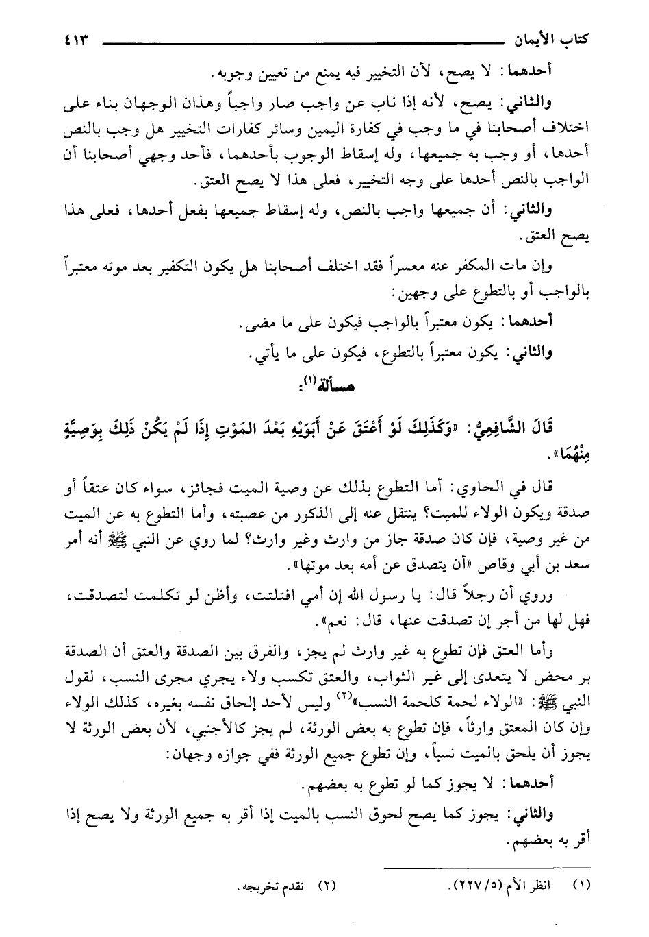 والثاني: يصح، لأنه إذا ناب عن واجب صار واجبًا وهذان الوجهان بناء على اختلاف أصحابنا في ما وجب في كفارة اليمين وسائر كفارات التخيير هل وجب بالنص أحدها، أو وجب به جميعها، وله إسقاط الوجوب بأحدهما، فأحد وجهي أصحابنا أن الواجب بالنص أحدها على وجه التخيير، فعلى هذا لا يصح العتق.