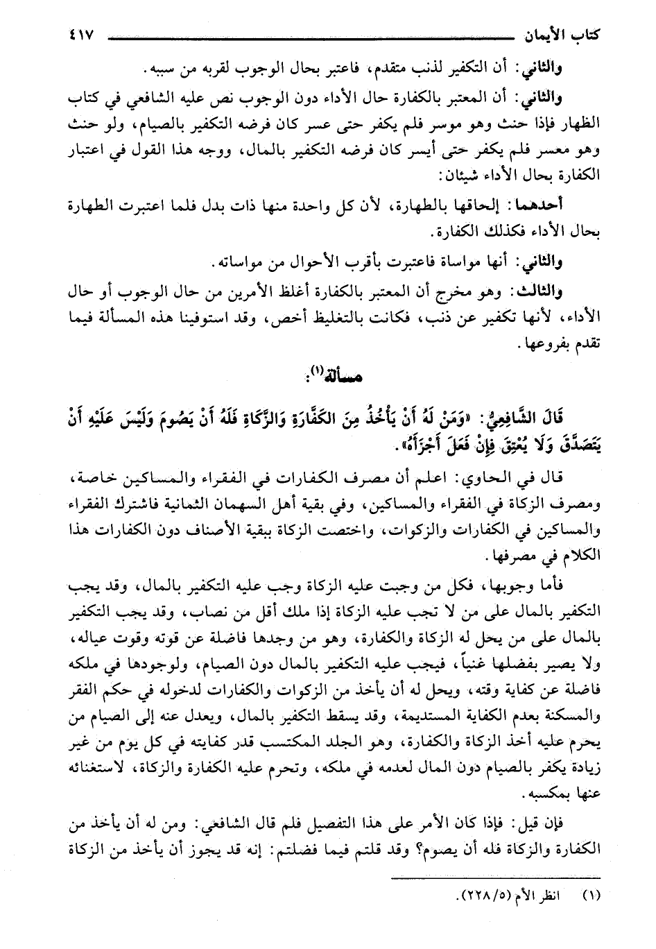 قَالَ الشَّافِعِيُّ: "وَمَنْ لَهُ أَنْ يَاخُذُ مِنَ الكَفَّارَةِ وَالزَّكَاةِ فَلَهُ أَنْ يَصُومَ وَلَيْسَ عَلَيْهِ أَنْ يَتَصَدَّقَ وَلا يُعْتِقَ فِإنْ فَعَلَ أَجْزَأًهُ ".