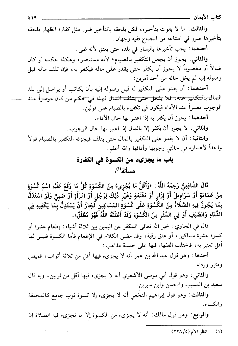 قَالَ الشَّافِعِيُّ رَحِمَهُ اللهُ: "وَأَقَلُّ مَا يُجْزِئُ منَ الكُسْوَةِ كُلُّ مَا وَقَعَ عَلَيْهِ اسْمُ كُسْوَةٍ مِنْ عَمَامَةٍ أَوْ سَرَاوِيلَ أَوْ إِزَارِ أَوْ مَقْنَعَةٍ وَغَيْرِ ذَلِكَ لِرَجُلِ أَوْ امْرَأَةٍ أَوْ صَبِيِّ وَلَوْ اسْتَدَلَّ بِمَا يَجُوزُ فيهِ الصَّلاَةُ مِنَ الكُسْوَةِ عَلَى كُسْوَةِ المَسَاكِينِ لجَازَ أَنْ يَسْتَدِلٌ بمَا يَكْفِيهِ فِي الشِّتَاءِ وَالصّيْفِ أَوْ فِي السَّفَرِ مِنْ الكُسْوَةِ وَقَدْ أَطْلَقَهُ اللهُ فَهُوَ مُطْلَقٌ ".