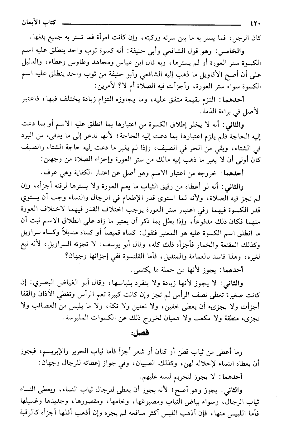 والخامس: وهو قول الشافعي وأبي حنيفة: أنه كسوة ثوب واحد ينطلق عليه اسم الكسوة ستر العورة أو لم يسترها، وبه قال ابن عباس ومجاد وطاوس وعطاء، والدليل على أن أصح الأقاويل ما ذهب إليه الشافعي وأبو حنيفة من ثوب واحد ينطلق عليه اسم الكسوة سواء ستر العورة، وأجزات فيه الصلاة أم لا؟ لأمرين:
