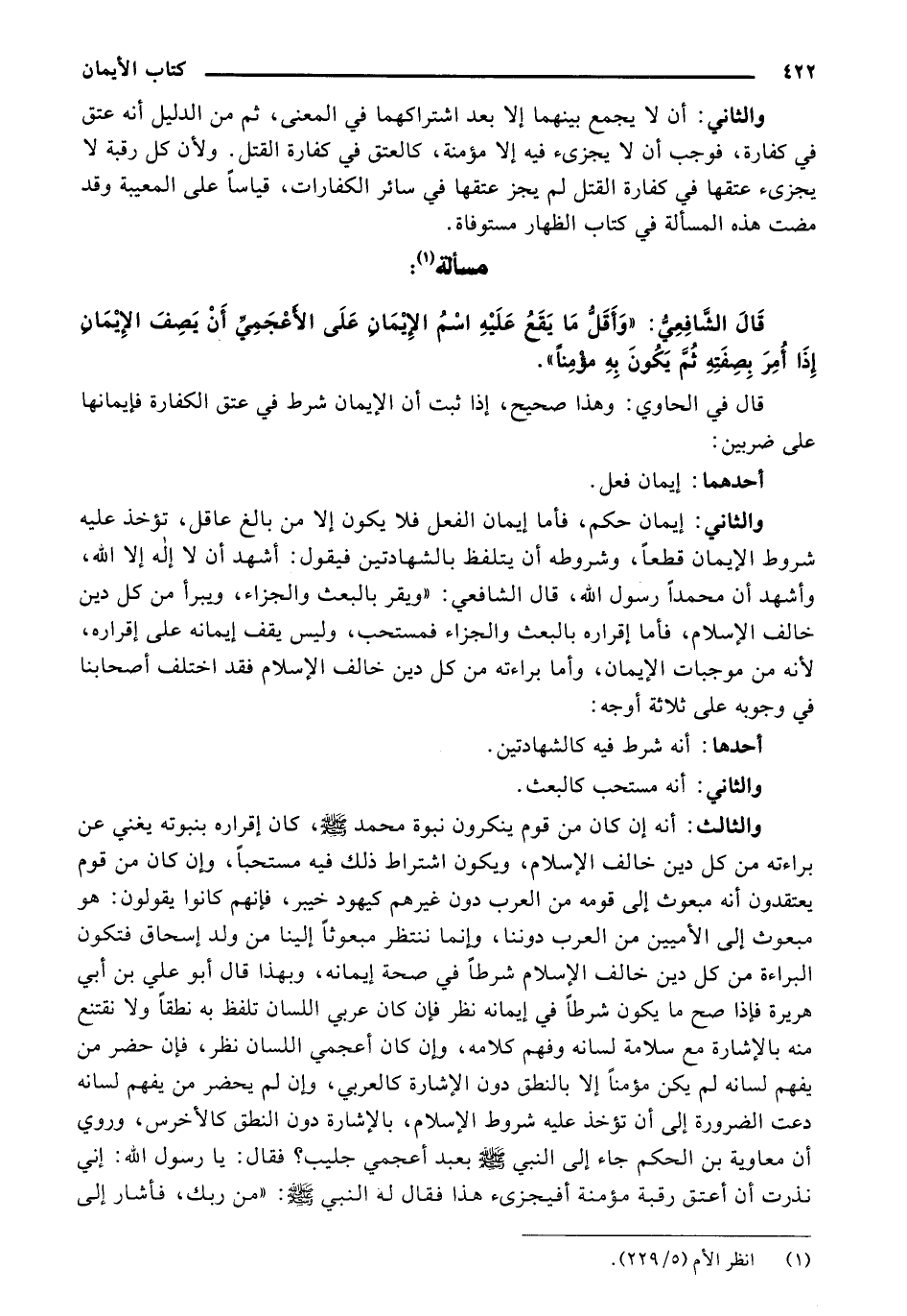 قال الشافعي:"وأقل ما يقع عليه اسم الإيمان علي الأعجمي أن يصف الإيمان أذا أمر بصفته ثم يكون به مؤمناً".