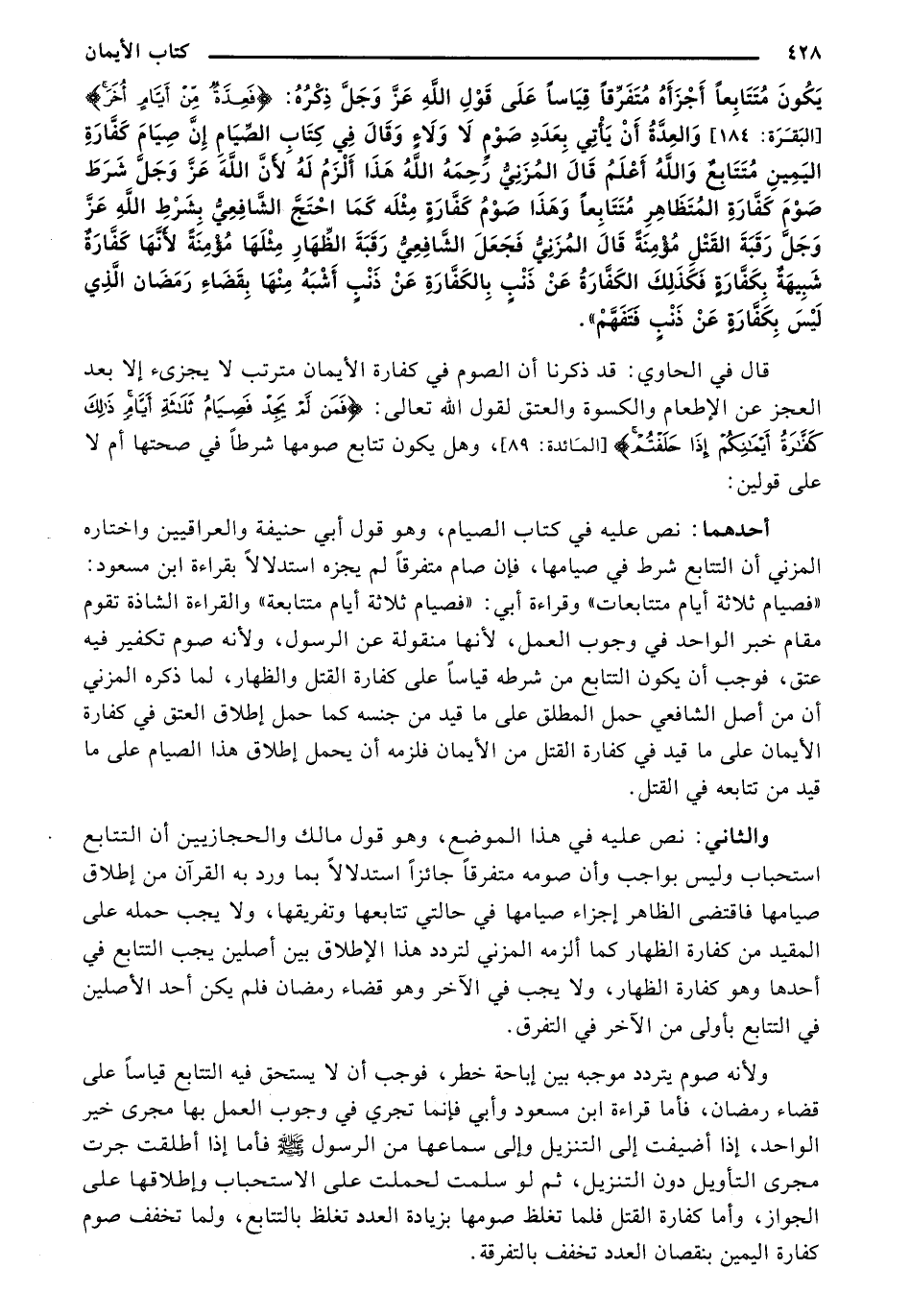 يكون متتابعاً أجزأه متفرقاً قياساً علي قوله الله عز وجل ذكره: (فَعِدَّةٌ مِّنْ أَيَّامٍ أُخَرَ) [البقرة:184] والعدة أن يأتي بعدد صوم لا ولاء وقال في كتاب الصيام أن صيام كفارة اليمين متتابع والله اعلم قال المزني رحمه الله هذا ألزم لأن الله عز وجل شرط صوم كفارة المتظاهر متتابعاً وهذا صوم كفارة مثله كما احتج الشافعي بشرط الله عز وجل رقبة القتل مؤمنه قال المزني فجعل الشافعي رقبة الظهار مثلها مؤمنه لأنها كفارة شبيه بكفارة فكذلك الكفارة عن ذنب بالكفارة عن ذنب أشبه منها بقضاء رمضان الذي ليس بكفارة عن ذنب فتفهم".