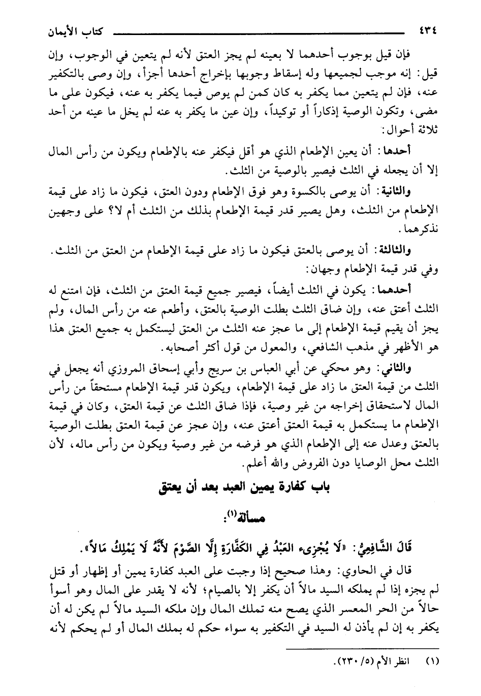 والثاني: وهو محكي عن أبي العباس بن سريج وأبي إسحاق المروزي أنه يجعل في الثلث من قيمة العتق ما زاد على قيمة الإطعام، ويكون قدر قيمة الإطعام مستحقًا من رأس المال لاستحقاق إخراجه من غير وصية، فإذا ضاق الثلث عن قيمة العتق، وكان في قيمة الإطعام ما يستكمل به قيمة العتق أعتق عنه، وإن عجز عن قيمة العتق بطلت الوصية بالعتق وعدل عنه إلى الإطعام الذي هو فرضه من غير وصية ويكون من رأس ماله، لأن الثلث محل الوصايا دون الفروض والله أعلم.