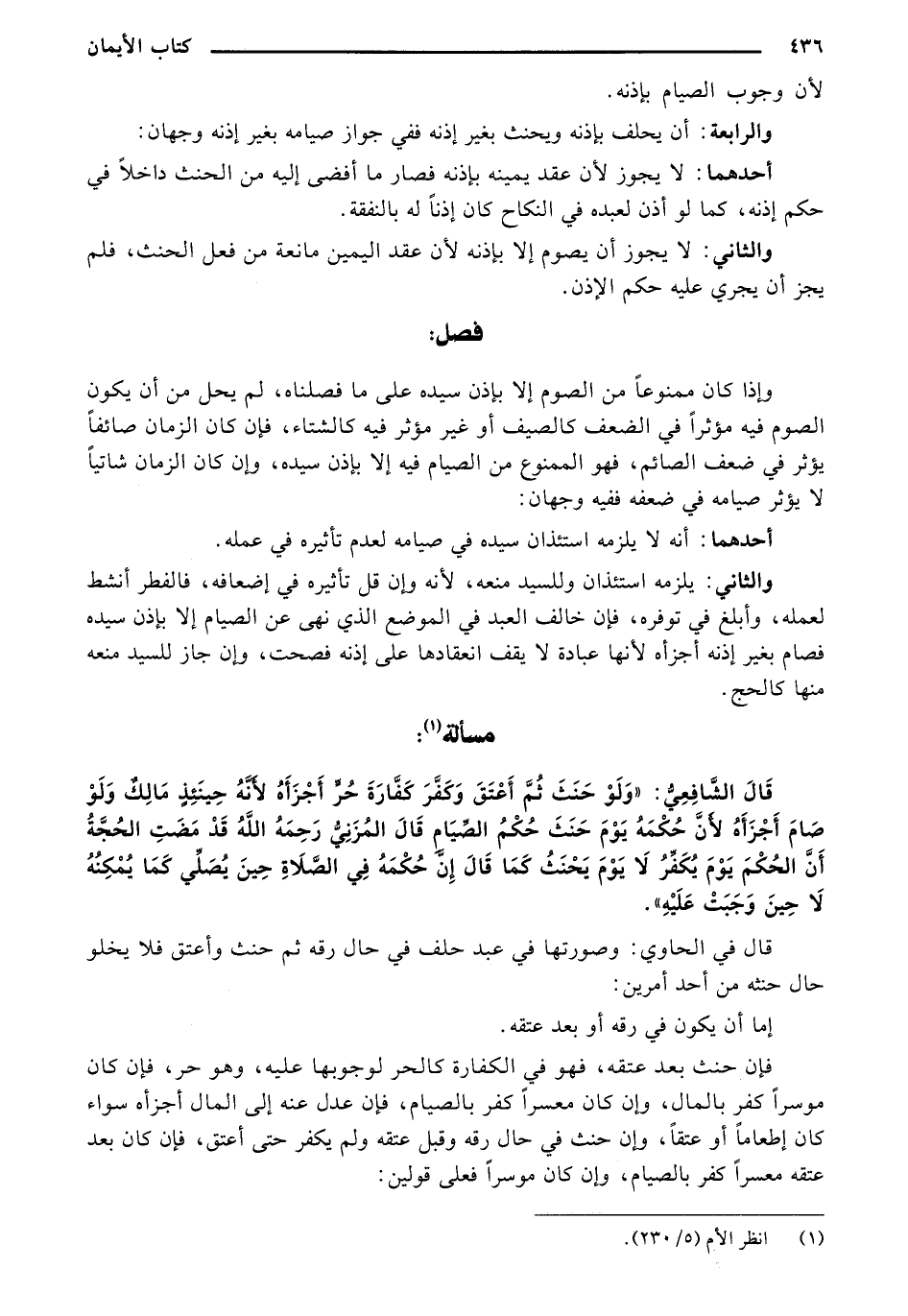 قَالَ الشَّافِعِيُّ: "وَلَوْ حَنَثَ ثُمَّ أَعْتَقَ وَكَفَّرَ كَفَّارَةَ حُرٍّ أَجْزَأَهُ لأَنَّه حِينَئِذٍ مَالِكٌ وَلَوْ صَامَ أَجْزَأَهُ لأَنَّ حُكْمَهُ يَوْمَ حَنَثَ حُكْمُ الصِّيَامِ قَالَ المزْنِيُّ رَحِمَهُ اللَّهُ قَدْ مَضَتِ الحُجَّةُ أَنَّ الحُكْمَ يَوْمَ يُكَفِّرُ لَا يَوْمَ يَحْنَثُ كَمَا قَالَ إِنَّ حُكْمِهِ فِي الصَّلَاةِ حِينَ يُصَلِّي كَمَا يُمْكِنُهُ لَا حِينَ وَجَبَتْ عَلَيْهِ".
