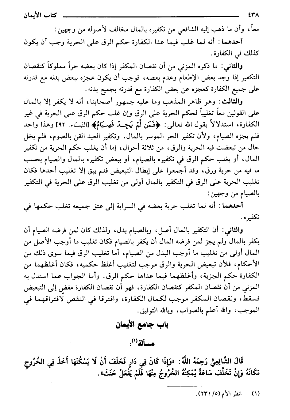 معًا، وأن ما ذهب إليه الشافعي من تكفيره بالمال مخالف لأصوله من وجهين: