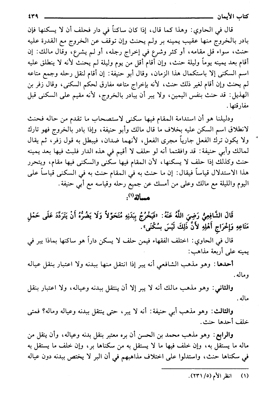 قال في الحاوي: وهذا كما قال، إذا كان ساكنًا في دار فحلف أن لا يسكنها فإن بادر بالخروج منها عقيب يمينه بر ولم يحنث وإن توقف عن الخروج مع القدرة عليه حنث، سواء قل مقامه، أو كثر وشرع في إخراج رجله، أو لم يشرع، وقال مالك: إن أقام بعد يمينه يومًا وليلة حنث، وإن أقام أقل من يوم وليلة لم يحنث لأنه لا ينطلق عليه اسم السكنى إلا باستكمال هذا الزمان، وقال أبو حنيفة: إن أقام لنقل رحله وجمع متاعه لم يحنث وإن أقام لغير ذلك حنث، لأنه بإخراج متاعه مفارق لحكم السكنى، وقال زفر بن الهذيل: قد حنث بنفس اليمين، ولا يبر أن يبادر بالخروج، لأنه مقيم على السكنى قبل مفارقتها.