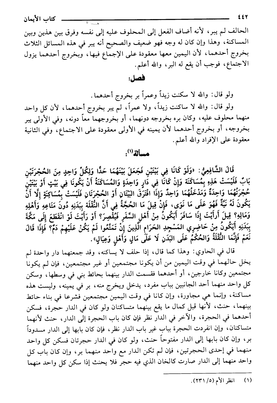 قَالَ الشّافِعِيُّ:" وَلَوْ كَانَا فِي بَيْتَيْنٍ فَجَعَلَ بَيَّنَهُمَا حَدًّا وَلِكُلُّ وَاحِدٍ مِنَ الْحَجَرَتَيْنِ بَابً فَلَيْسَتْ هَذِهٍ بِمُسَاكَنَةٍ وَإِنَّ كَانَا فِي دَارِ وَاحِدَةٍ وَالْمُسَاكَنَةَ أَنْ يَكُونَا فِي بَيْتٍ أَوْ بَيْتَيْنِ حُجْرَتِهُمَا وَاحِدَةٍ وَمَدْخَلُهُمَا وَاحِدٌ وَإِذَا اِفْتَرَقَ الْبَيْتَانِ أَوْ الْحَجَرَتَانِِ فَلَيْسَتْ بِمساكِنَةٍ إلّا أَنْ يَكُونُ لَهُ نِيَّةٌ فَهُوَ عَلَى مَا نَوَى، فَإِنَّ قَيَّلَ مَا الْحُجَّةُ فِي أَنَّ النُّقْلَةَ بِبَدَنِهِ دُونَ مَتَاعِهِ وَأُهِلُّهُ وَمَالَهُ؟ قَيَّلَ أَرَأَيْتِ إِذَا سَافِرِ أَيَكُونُ مَنْ أهْلُ السَّفَرِ فَيَقْصُرُ؟ أَوْ رَأَيْتِ لَوْ اِنْقَطَعَ إلى مَكَّةٍ بِبَدَنِهِ أَيَكُونُ مِنْ حاضِرِي الْمَسْجِدِ الْحَرامَ الَّذِينَ إِنَّ تُمَتِّعُوا لَمْ يَكُنْ عَلِيُّهُمْ دَمٍ؟ فَإِذَا قَالٍ نَعَمْ فَإِنَّمَا النُّقْلَةَ وَالْحُكْمَ عَلَى الْبَدَنِ لَا عَلَى مَالِ وَأَهُلُّ وَعِيَالَ".