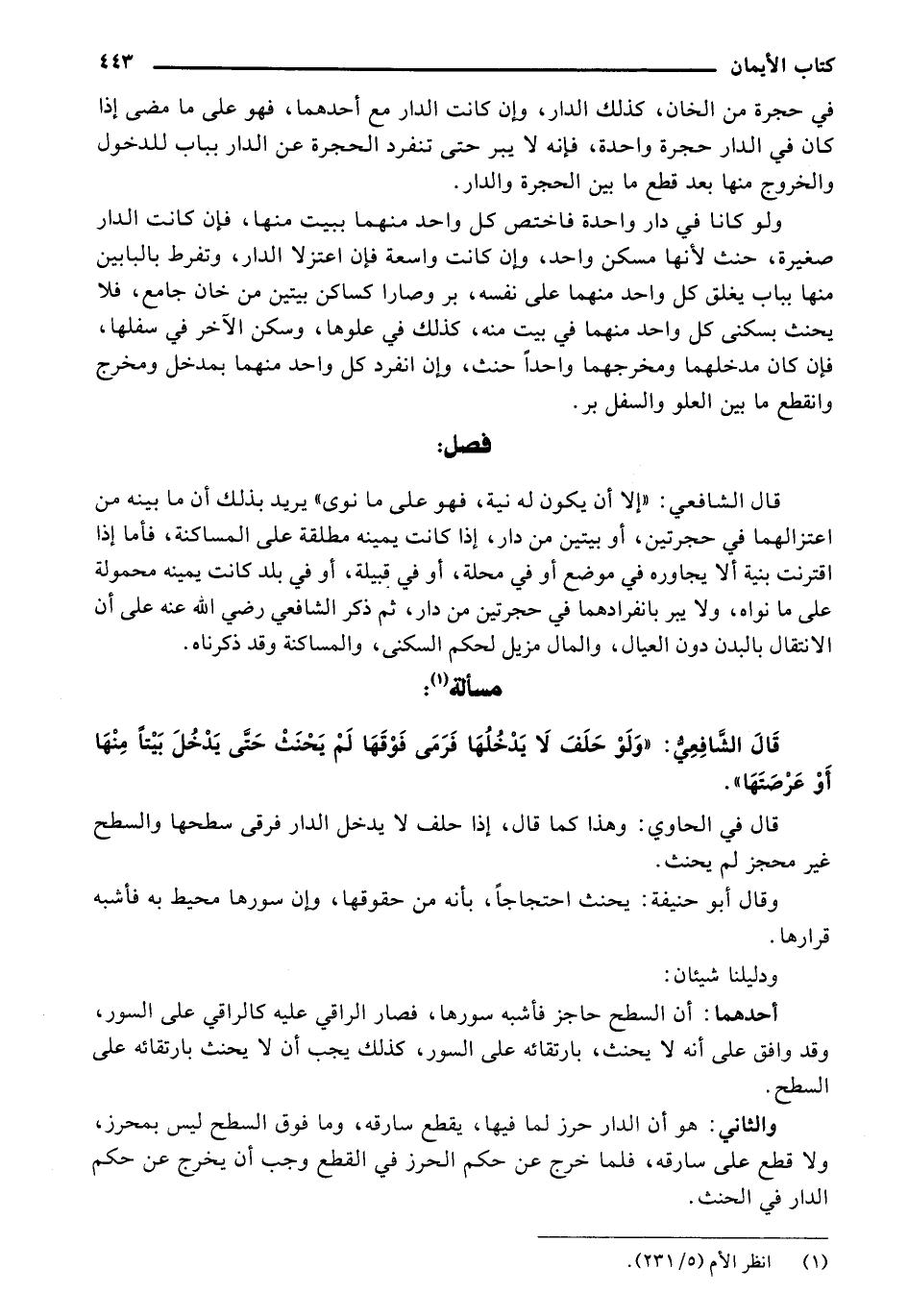 قَالَ الشّافِعِيُّ:" وَلَوْ حِلْفً لَا يَدْخُلْهَا فرمى فَوْقَهَا لَمْ يَحْنَثْ حَتَّى يَدْخُلَ بَيْتًا مِنْهَا أَوْ عَرْصَتَهَا".