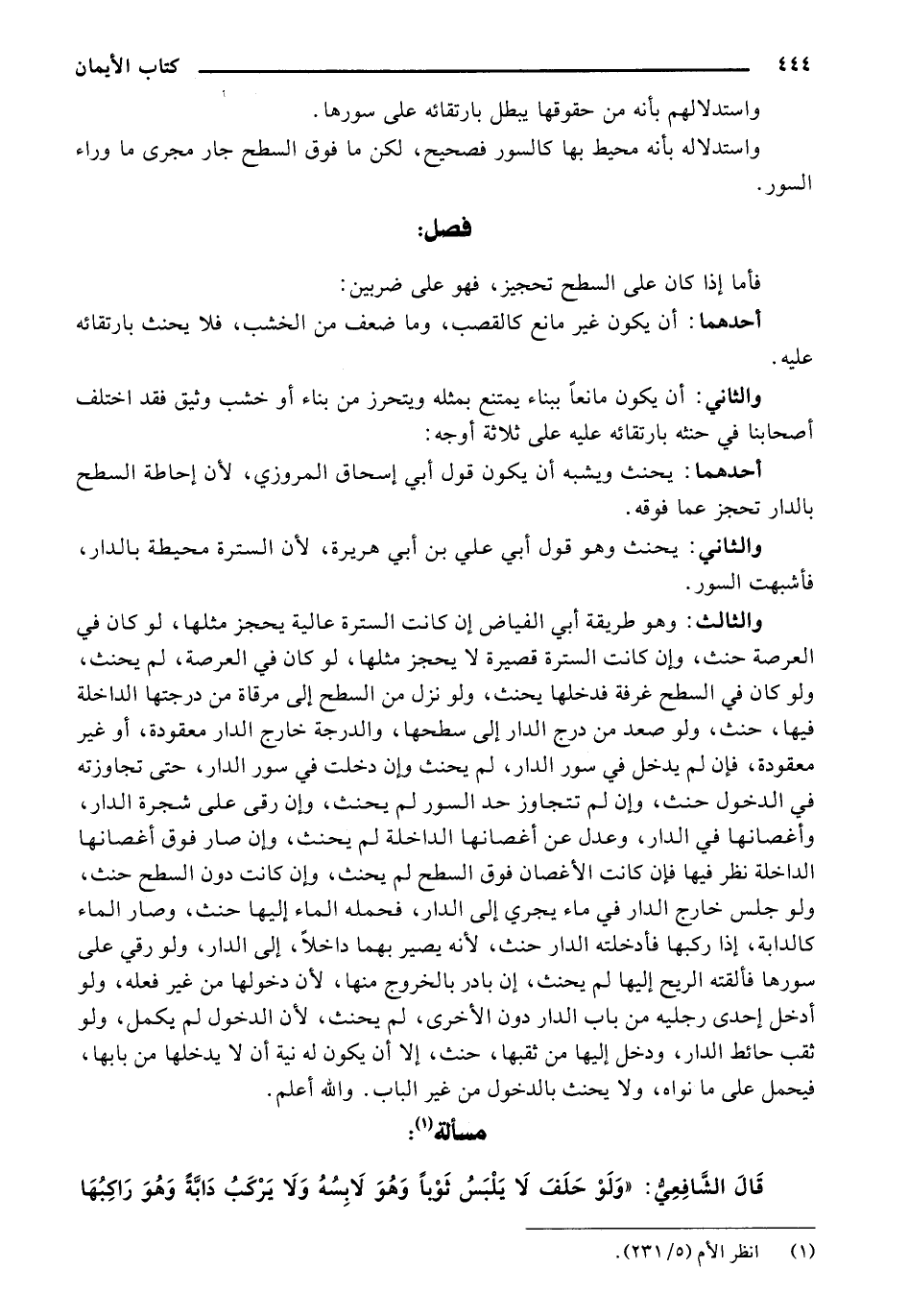 والثالث: وهو طريقة أبي الفياض إن كانت السترة عالية يحجز مثلها، لو كان في العرصة حنث، وإن كانت السترة قصيرة لا يحجز مثلها، لو كان في العرصة، لم يحنث، ولو كان في السطح غرفة فدخلها يحنث، ولو نزل من السطح إلى مرقاة من درجتها الداخلة فيها، حنث، ولو صعد من درج الدار إلى سطحها، والدرجة خارج الدار معقودة، أو غير معقودة، فإن لم يدخل في سور الدار، لم يحنث وإن دخلت في سور الدار، حتى تجاوزته في الدخول حنث، وإن لم تتجاوز حد السور لم يحنث، وإن رقى على شجرة الدار، وأغصانها في الدار، وعدل عن أغصانها الداخلة لم يحنث، وإن صار فوق أغصانها الداخلة نظر فيها فإن كانت الأغصان فوق السطح لم يحنث، وإن كانت دون السطح حنث، ولو جلس خارج الدار في ماء يجري إلى الدار، فحمله الماء إليها حنث، وصار الماء كالدابة، إذا ركبها فأدخلته الدار حنث، لأنه يصير بهما داخلًا، إلى الدار، ولو رقى على سورها فألقته الريح إليها لم يحنث، إن بادر بالخروج منها، لأن دخولها من غير فعله، ولو أدخل إحدى رجليه من باب الدار دون الأخرى، لم يحنث، لأن الدخول لم يكمل، ولو ثقب حائط الدار، ودخل إليها من ثقبها، حنث، إلا أن يكون له نية أن لا يدخلها من بابها، فيحمل على ما نواه، ولا يحنث بالدخول من غير الباب، والله أعلم.