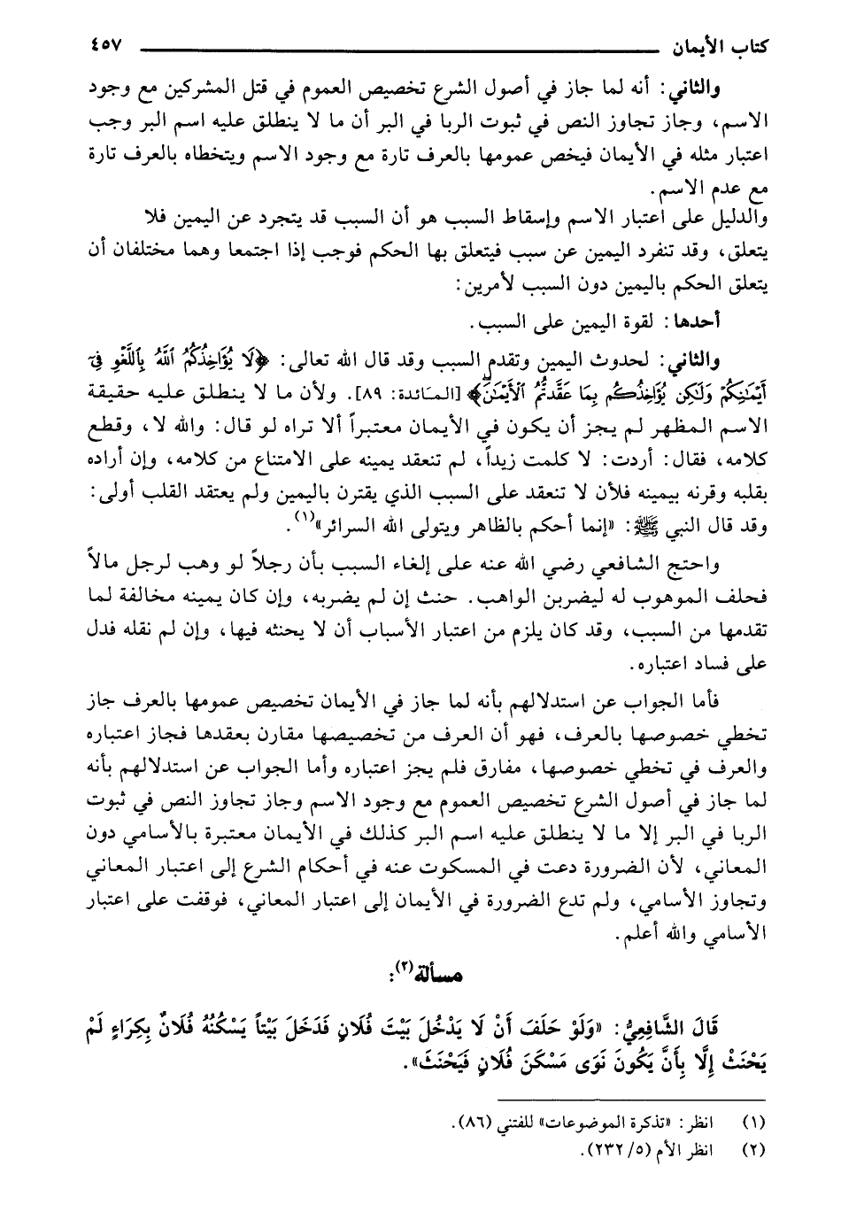 والدليل على اعتبار الاسم وإسقاط السبب هو أن السبب قد يتجرد عن اليمين فلا يتعلق، وقد تنفرد اليمين عن سبب فيتعلق بها الحكم فوجب إذا اجتمعا وهما مختلفان أن يتعلق الحكم باليمين دون السبب لأمرين: