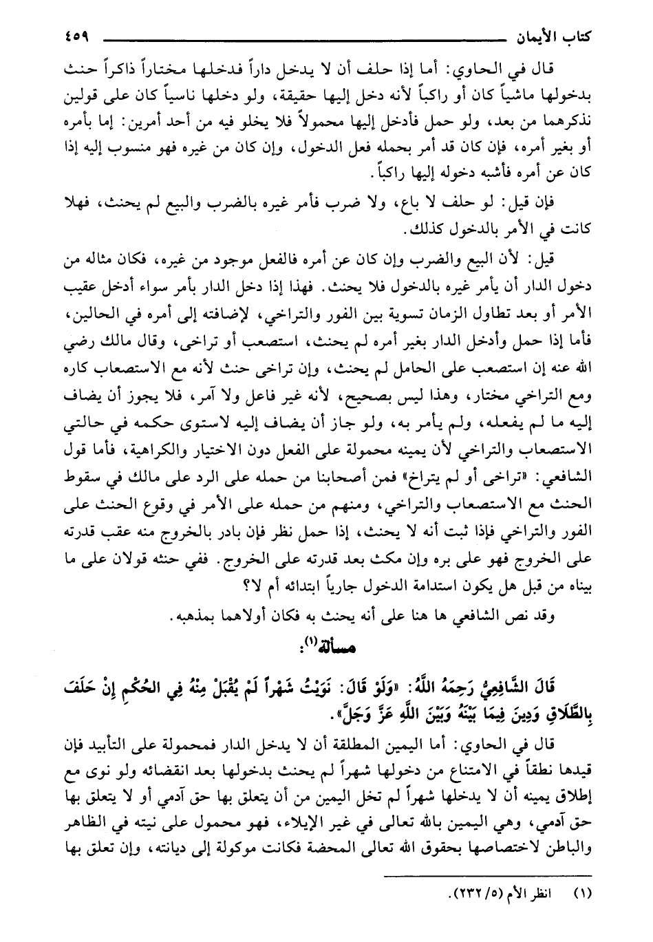 قيل: لأن البيع والضرب وإن كان عن أمره فالفعل موجود من غيره، فكان مثاله من دخول الدار أن يأمر غيره بالدخول فلا يحنث. فهذا إذا دخل الدار بأمر سواء أدخل عقيب الأمر أو بعد تطاول الزمان تسوية بين الفور والتراخي، لإضافته إلى أمره في الحالين، فأما إذا حمل وأدخل الدار بغير أمره لم يحنث، استصعب أو تراخى، وقال مالك رضي الله عنه إنه استصعب على الحامل لم يحنث، وإن تراخى حنث لأنه مع الاستصعاب كاره ومع التراخي مختار، وهذا ليس بصحيح، لأنه غير فاعل ولا آمر، فلا يجوز أن يضاف إليه ما لم يفعله، ولم يأمر به، ولو جاز أن يضاف إليه لاستوى حكمه في حالتي الاستصعاب والتراخي لأنه يمينه محمولة على الفعل دون الاختيار والكراهية، فأما قول الشافعي: "تراخى أو لم يتراخ" فمن أصحابنا من حمله على الرد على مالك في سقوط الحنث مع الاستصعاب والتراخي، ومنهم من حمله على الأمر في وقوع الحنث على الفور والتراخي فإذا ثبت أنه لا يحنث، إذا حمل نظر فإن بادر بالخروج منه عقب قدرته على الخروج فهو على بره وإن مكث بعد قدرته على الخروج. ففي حنثه قولان على ما بيناه من قبل هل يكون استدامة الدخول جاريًا ابتدائه أم لا؟