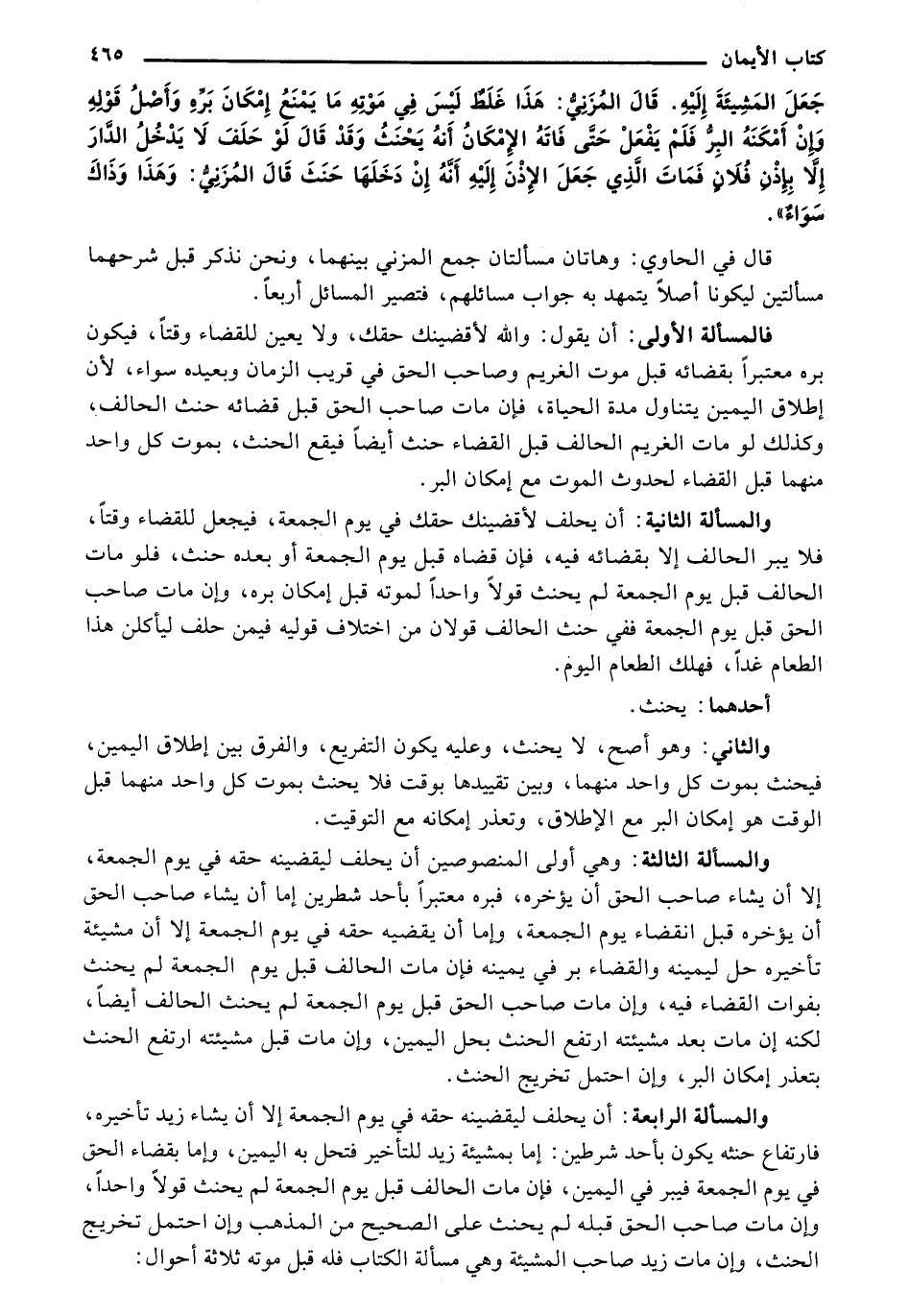 والمسألة الرابعة: أن يحلف ليقضينه حقه في يوم الجمعة إلا أن يشاء زيد تأخيره، فارتفاع حنثه يكون بأحد شرطين: إما بمشيئة زيد للتأخير فتحل به اليمين، وإما بقضاء الحق في يوم الجمعة فيبر في اليمين، فإن مات الحالف قبل يوم الجمعة لم يحنث قولًا واحدًا، وإن مات صاحب الحق قبله لم يحنث على الصحيح من المذهب وإن احتمل تخريج الحنث، وإن مات زيد صاحب المشيئة وهي مسألة الكتاب فله قبل موته ثلاثة أحوال: