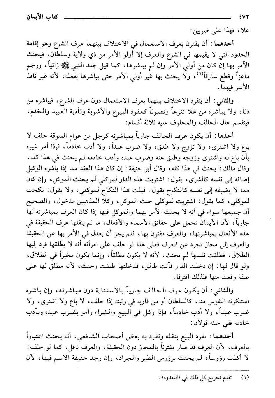 أحدهما: أن يقترن بعرف الاستعمال في الاختلاف بينهما عرف الشرع وهو إقامة الحدود التي لا يقيمها في الشرع والعرف إلا أولو الأمر من ذي ولاية وسلطان، فيحنث الآمر بها إن كان من أولي الأمر وإن لم يباشرها، كما قيل جلد النبي صلى الله عليه وسلم زانيًا، ورجم ماعزًا وقطع سارقًا، ولا يحنث بها غير أولي الأمر حتى يباشرها بفعله، لأنه غير نافذ الأسر فيهما.