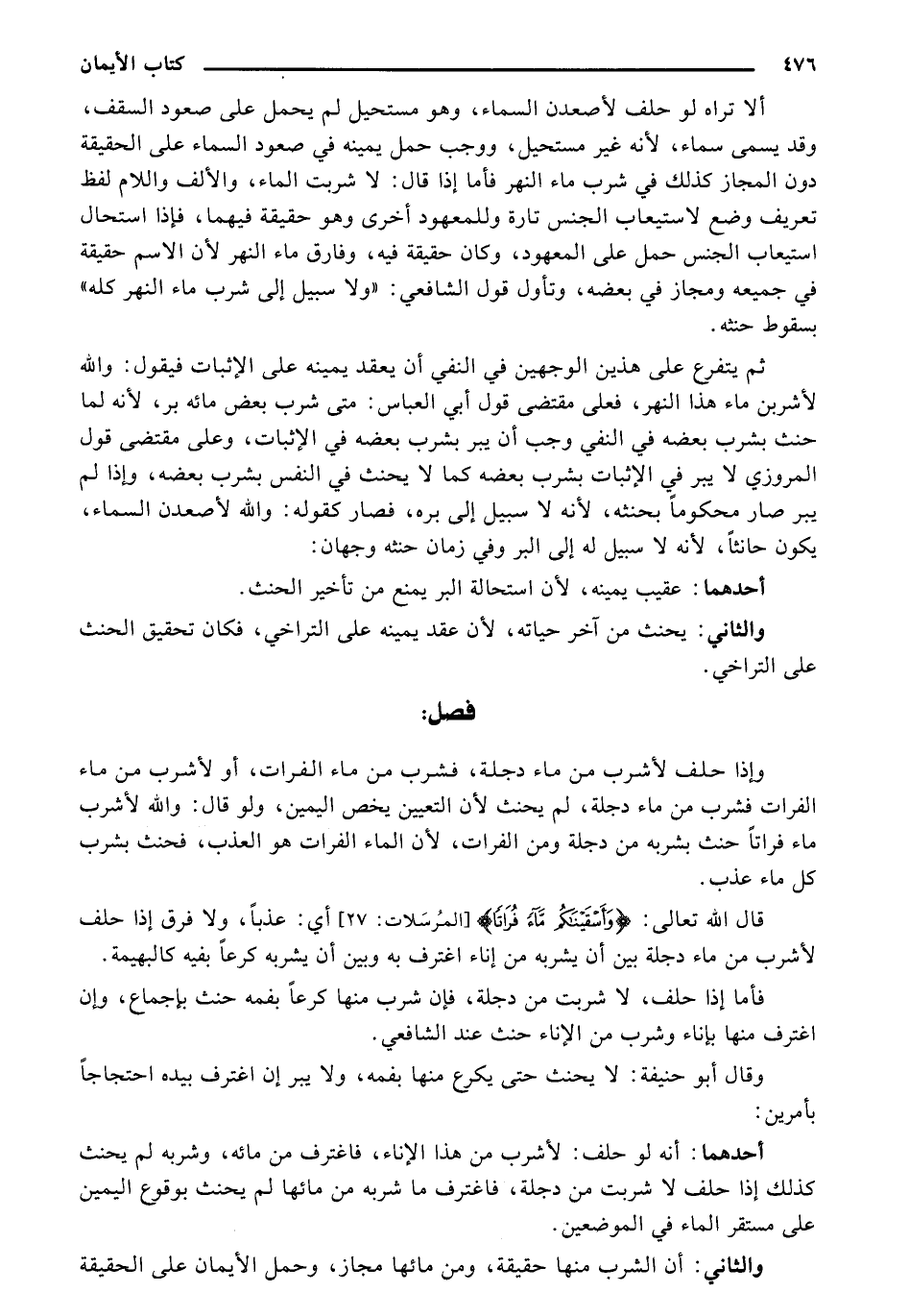 ألا تراه لو حلف لأصعدن السماء، وهو مستحيل لم يحمل على صعود السقف، وقد يسمى سماء، لأنه غير مستحيل، ووجب حمل يمينه في صعود السماء على الحقيقة دون المجاز كذلك في شرب ماء النهر فأما إذا قال: لا شربت الماء، والألف واللام لفظ تعريف وضع لاستيعاب الجنس تارة وللمعهود أخرى وهو حقيقة فيهما، فإذا استحال استيعاب الجنس حمل على المعهود، وكان حقيقة فيه، وفارق ماء النهر لأن الاسم حقيقة في جميعه ومجاز في بعضه، وتأول قول الشافعي: "ولا سبيل إلى شرب ماء النهر كله" بسقوط حنثه.