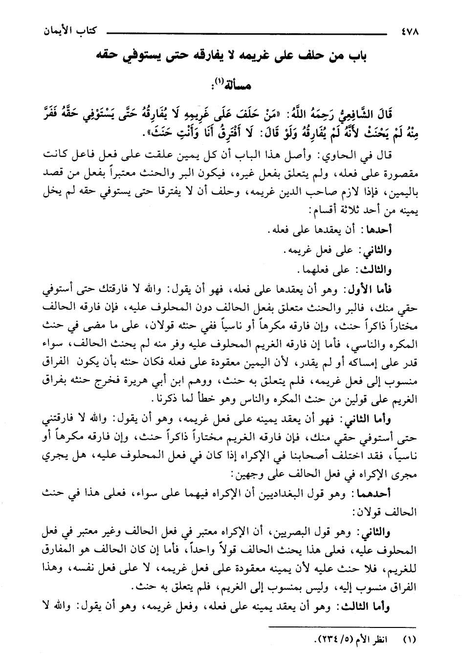 فأما الأول: وهو أن يعقدها على فعله، فهو أن يقول: والله لا فارقتك حتى أستوفي حقي منك، فالبر والحنث متعلق بفعل الحالف دون المحلوف عليه، فإن فارقه الحالف مختارًا ذاكرًا حنث، وإن فارقه مكرهًا أو ناسيًا ففي حنثه قولان، على ما مضى في حنث المكره والناسي، فأما إن فارقه الغريم المحلوف عليه وفر منه لم يحنث الحالف، سواء قدر على إمساكه أو لم يقدر، لأن اليمين معقودة على فعله فكان حنثه بأن يكون الفراق منسوب إلى فعل غريمه، فلم يتعلق به حنث، ووهم ابن أبي هريرة فخرج حنثه بفراق الغريم على قولين من حنث المكره والناس وهو خطأ لما ذكرنا.