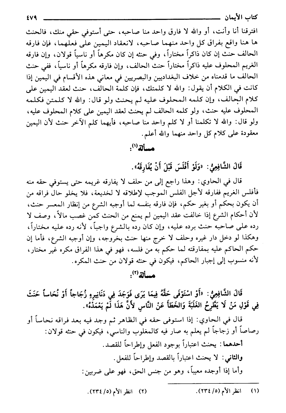 قال في الحاوي: وهذا راجع إلى من حلف لا يفارقه غريمه حتى يستوفي حقه منه فأفلس الغريم ففارقه لأجل الفلس الموجب لإطلاقه لا لخديعة، فلا يخلو حال فراقه من أن يكون بحكم أو بغير حكم، فإن فارقه بنفسه لما أوجبه الشرع من إنظار المعسر حنث، لأن أحكام الشرع إذا خالفت عقد اليمين لم يمنع من الحنث كمن غصب مالاً، وصف لا رده على صاحبه حنث برده عليه، وإن كان رده بالشرع واجبًا، لأنه رده عليه مختارًا، وهكذا لو دخل دار غيره وحلف لا خرج منها حنث بخروجه، وإن أوجبه الشرع، فأما إن حكم الحاكم عليه بمفارقته لما حكم به من فلسه، فهو في هذا الفراق مكره غير مختار، لأنه منسوب إلى إجبار الحاكم، فيكون في حنثه قولان من حنث المكره.