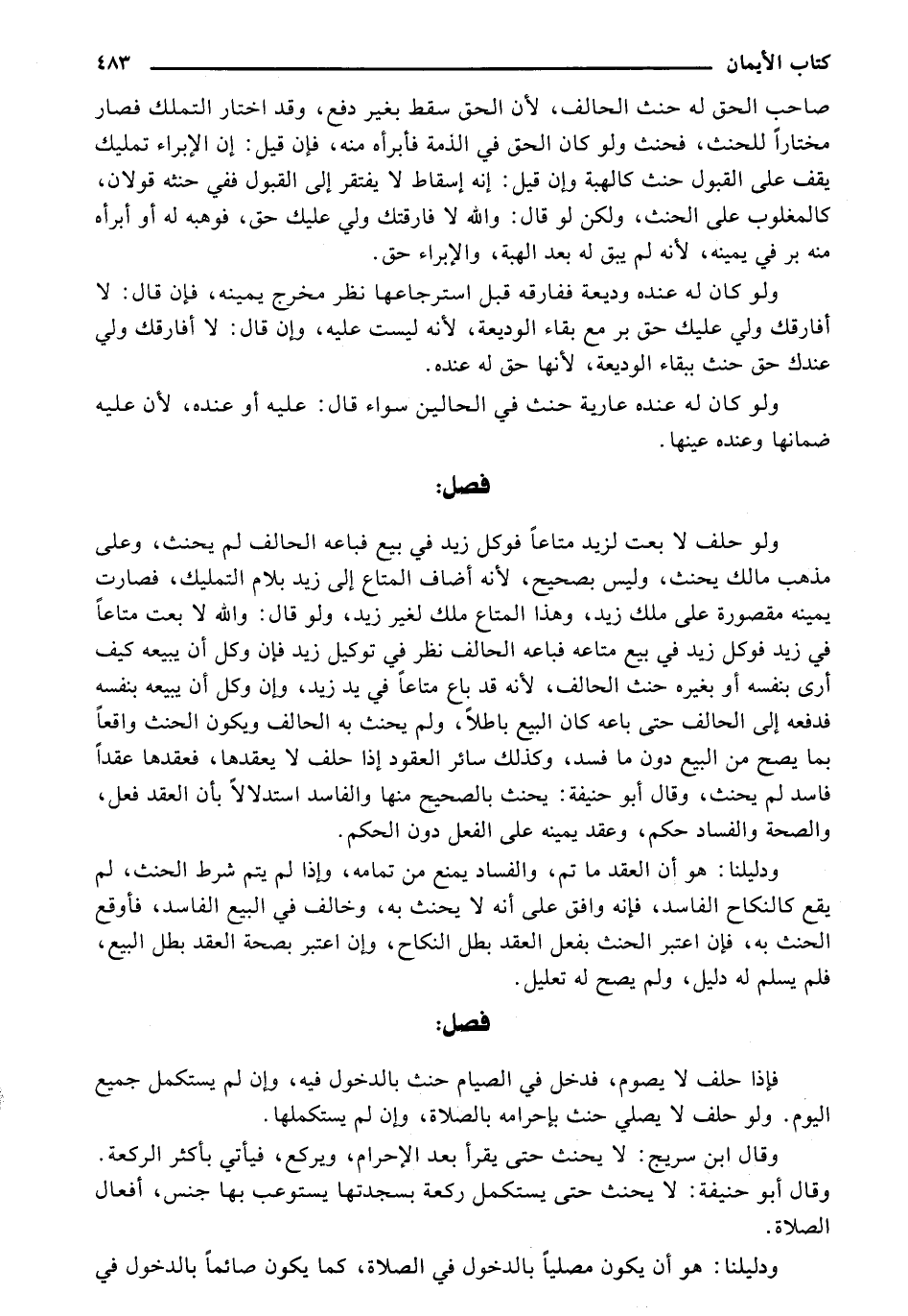 فإذا حلف لا يصوم، فدخل في الصيام حنث بالدخول فيه، وإن لم يستكمل جميع اليوم. ولو حلف لا يصلي حنث بإحرامه بالصلاة، وإن لم يستكملها.