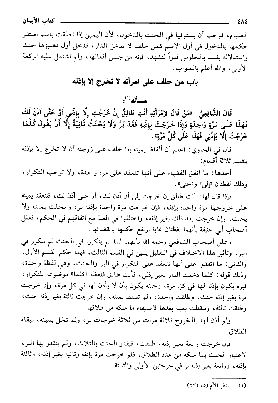 قال الشافعي: "من قال لامرأته أنتِ طالق إن خرجت إلا بإذني أو حتى آذن لك فهذا على مرة واحدة وإذا خرجت بإذنه فقد بر ولا يحنث ثانية إلا أن يقول كلما خرجت إلا بإذني فهذا على كل مرة".