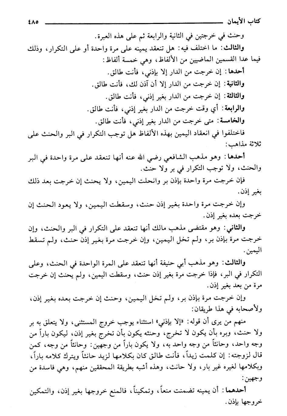 منهم من يرى أن قوله: "إلا بإذني" استثناء يوجب خروج المستثنى، ولا يتعلق به بر ولا حنث، وبره بأن يكون لا تخرج، وحنثه يكون بأن تخرج بغير إذن، ليكون بارًا من وجه واحد، وحانثًأ من وجه واحد به، ولا يكون بارًا من وجهين: وحانثًا من وجه، كمن قال لزوجته: إن كلمت زيدًا، فأنت طالق كان بكلامها لزيد حانثًا ويترك كلامه بارًا، وبكلامها لغيره غير بار، ولا حانث، وهذه أشبه بطريقة المحققين منهم، وهي فاسدة من وجهين: