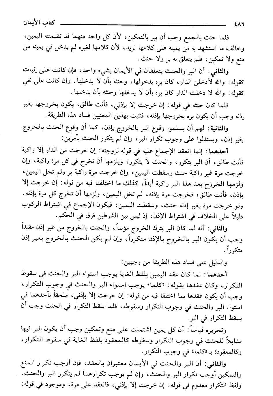 والثاني: أنه لما كان البر يترك الخروج مؤبدًا، والحنث بالخروج من غير إذن مقيدًا وجب أن يكون البر بالخروج بالإذن متكررًا، وإن لم يكن الحنث بالخروج بغير إذن متكررًا.