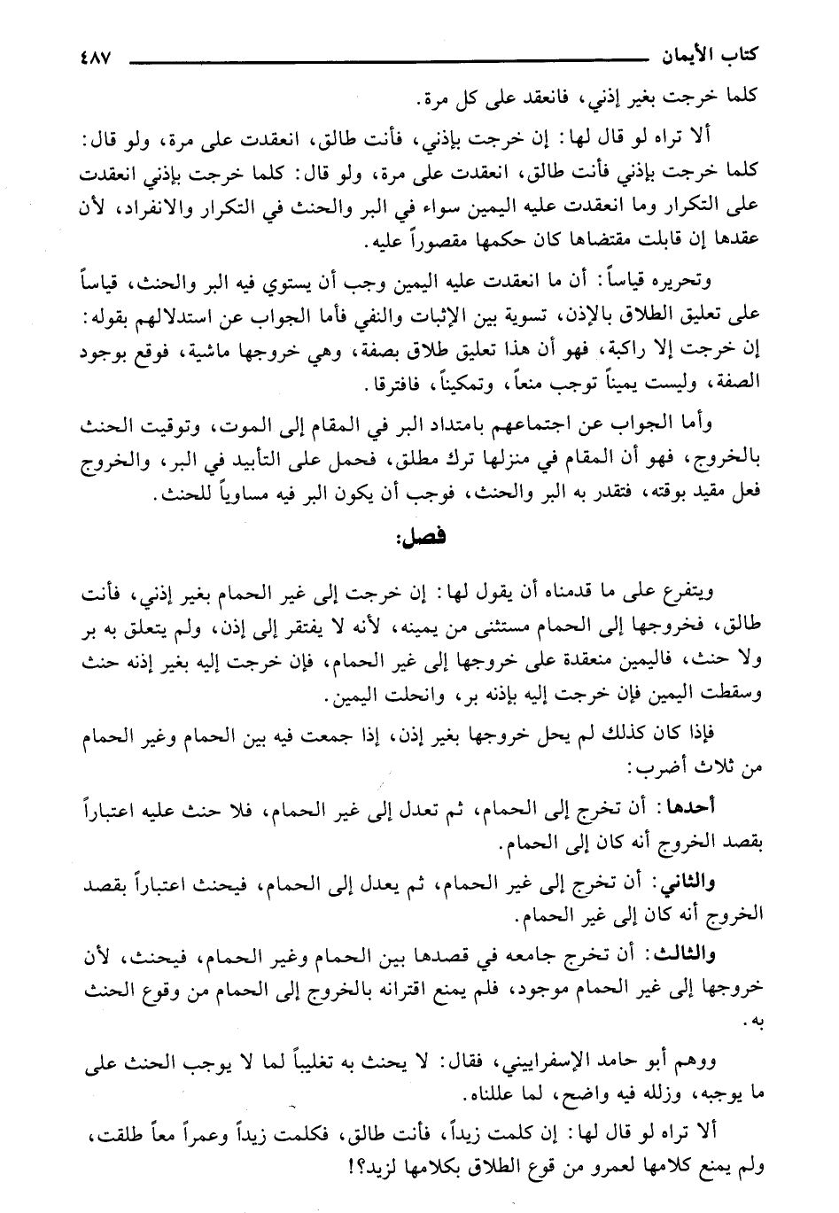 فإذا كان كذلك لم يحل خروجها بغير إذن، إذا جمعت فيه بين الحمام وغير الحمام من ثلاث أضرب: