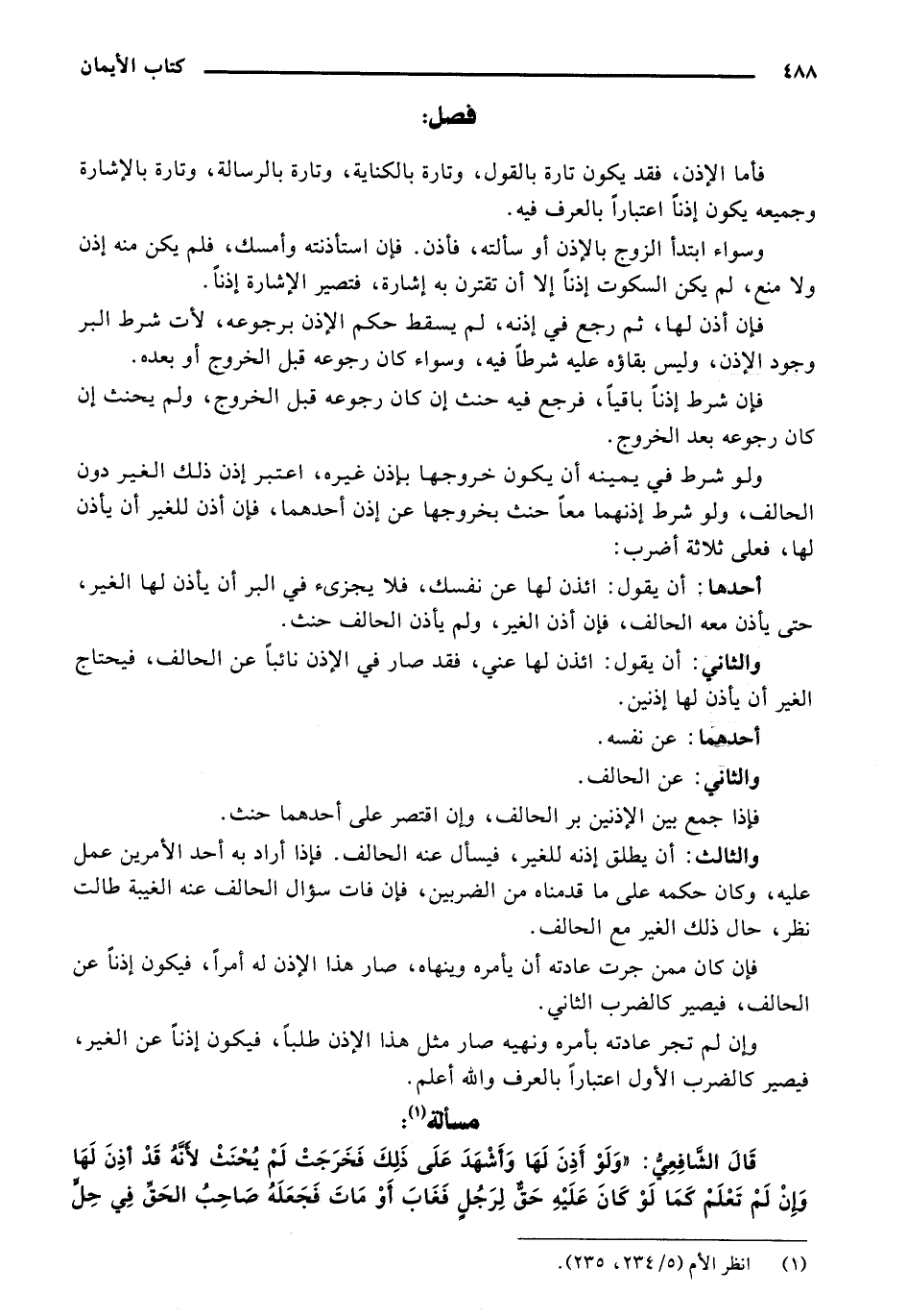 ولو شرط في يمينه أن يكون خروجها بإذن غيره، اعتبر إذن ذلك الغير دون الحالف، ولو شرط إذنهما معًا حنث بخروجها عن إذن أحدهما، فإن أذن للغير أن يأذن لها، فعلى ثلاثة أضرب: