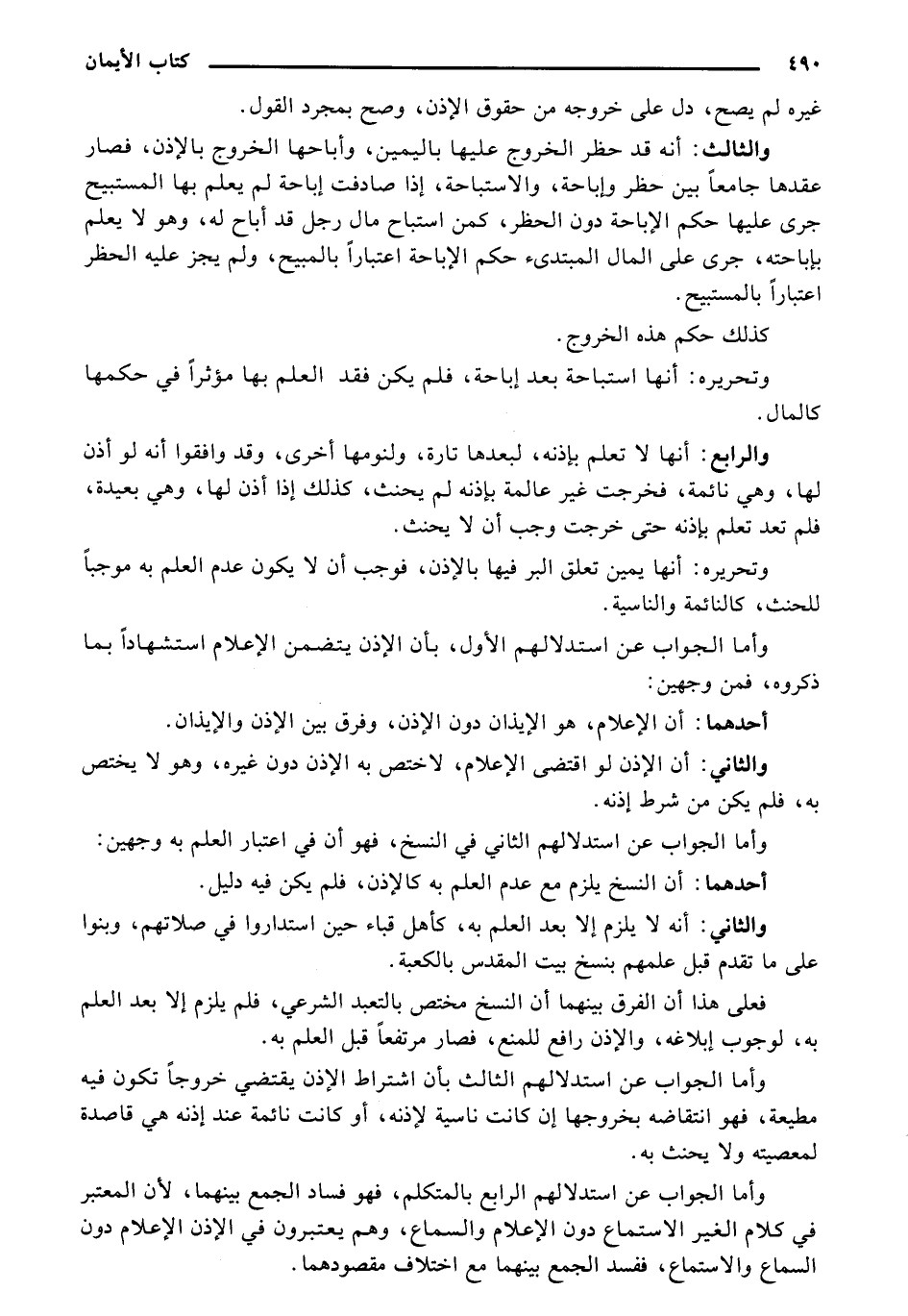 وأما الجواب عن استدلالهم الثالث بأن اشتراط الإذن يقتضي خروجًا تكون فيه مطيعة، فهو انتقاضة بخروجها إن كانت ناسية لإذنه، أو كانت نائمة عند إذنه هي قاصدة لمعصيته ولا يحنث به.