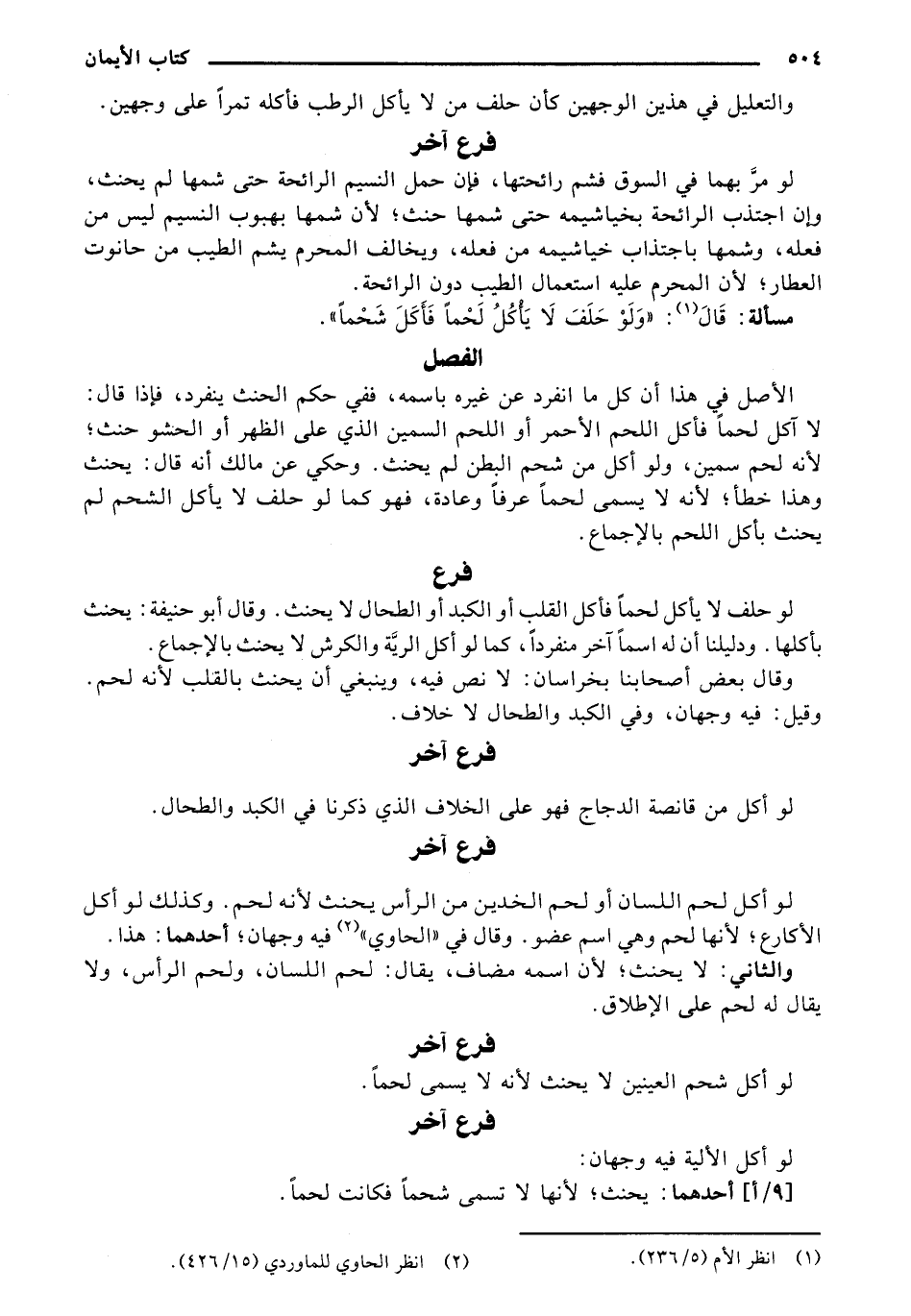 الأصل في هذا أن كل ما انفرد عن غيره باسمه، ففي حكم الحنث ينفرد، فإذا قال: لا آكل لحمًا فأكل اللحم الأحمر أو اللحم السمين الذي على الظهر أو الحشو حنث؛ لأنه لحم سمين، ولو أكل من شحم البطن لم يحنث. وحكي عن مالك أنه قال: يحنث وهذا خطأ؛ لأنه لا يسمى لحمًا عرفًا وعادة، فهو كما لو حلف لا يأكل الشحم لم يحنث بأكل اللحم بالإجماع.